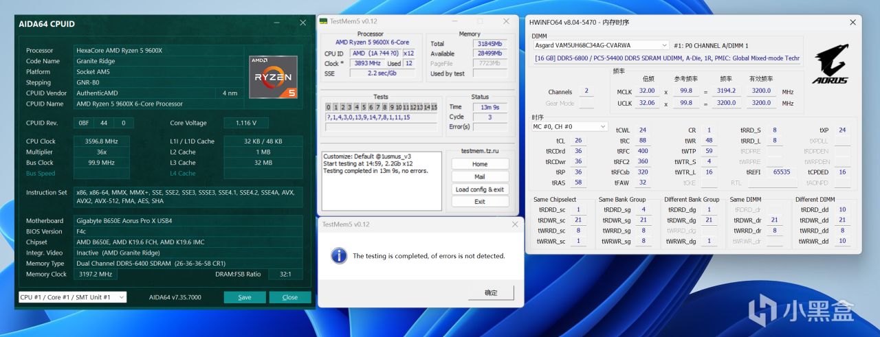 銳龍5 9600X超頻DDR5 6400C26-36-36-58,UCLK=MEMCLK同頻,過測TM5 1usmus_V3十分鐘配置烤機,具體小參如上,主時序、副時序和第三時序均有調整