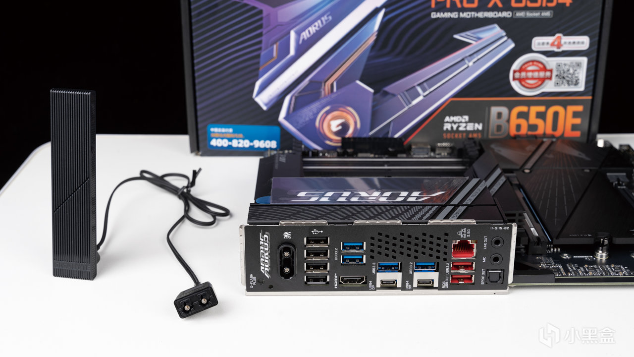 B650E電競雕後者I/O部分,從左到右分別是Wi-Fi 7、4*USB 2.0、4*USB 3.2 GEN 1、2*USB 3.2 GEN 2(紅色)、2*USB 4 Type-C、HDMI 2.1、RJ45網口、3組音頻接口包括S/PDIF(ALC1220),其中USB 4接口是原生的,帶寬由CPU提供,支持DP Alt視頻輸出,速率可達到40Gbps,搭配銳龍9000處理器可以滿血使用。另外主板配備的Wi-Fi天線也是快易拆設計,無需擰螺絲插拔安裝即可。