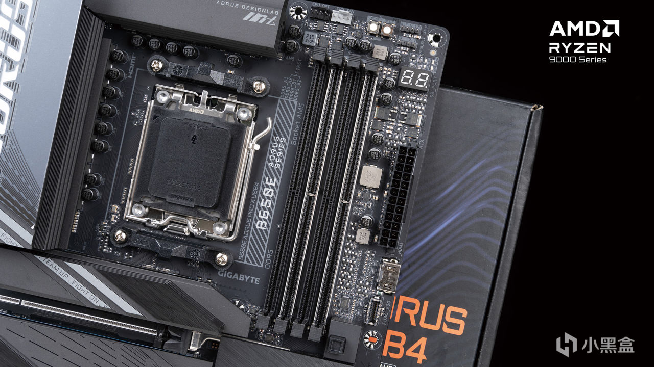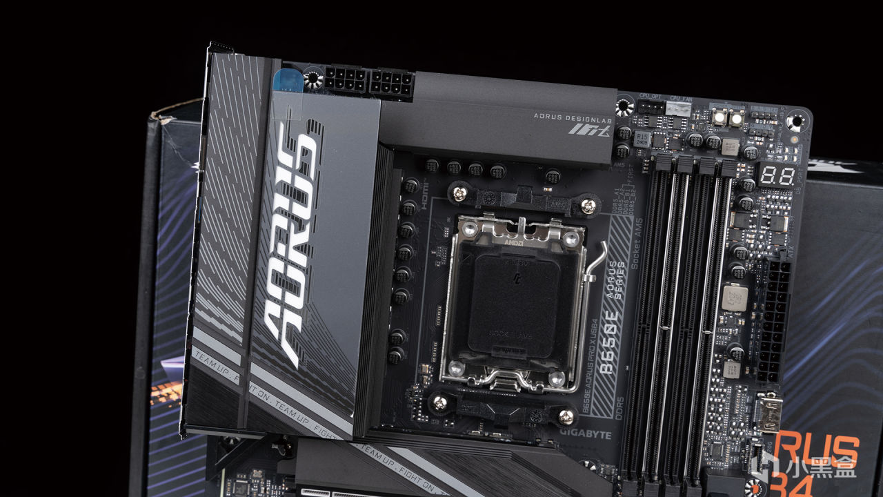 本次折騰全程使用來自技嘉的B650E AORUS PRO X USB4電競雕主板(以下簡稱B650E電競雕),主板外觀採用技嘉家族式的簡約線條風格,裝甲上還有兩個反轉對稱的雕頭裝飾。第一眼上手好評的是,數顯DEBUG燈就坐落在主板右上方,還配備了POWER和RESET簡易按鈕,對於超頻玩家更友好,這種配置在2K以下價位確實很少能見到了。