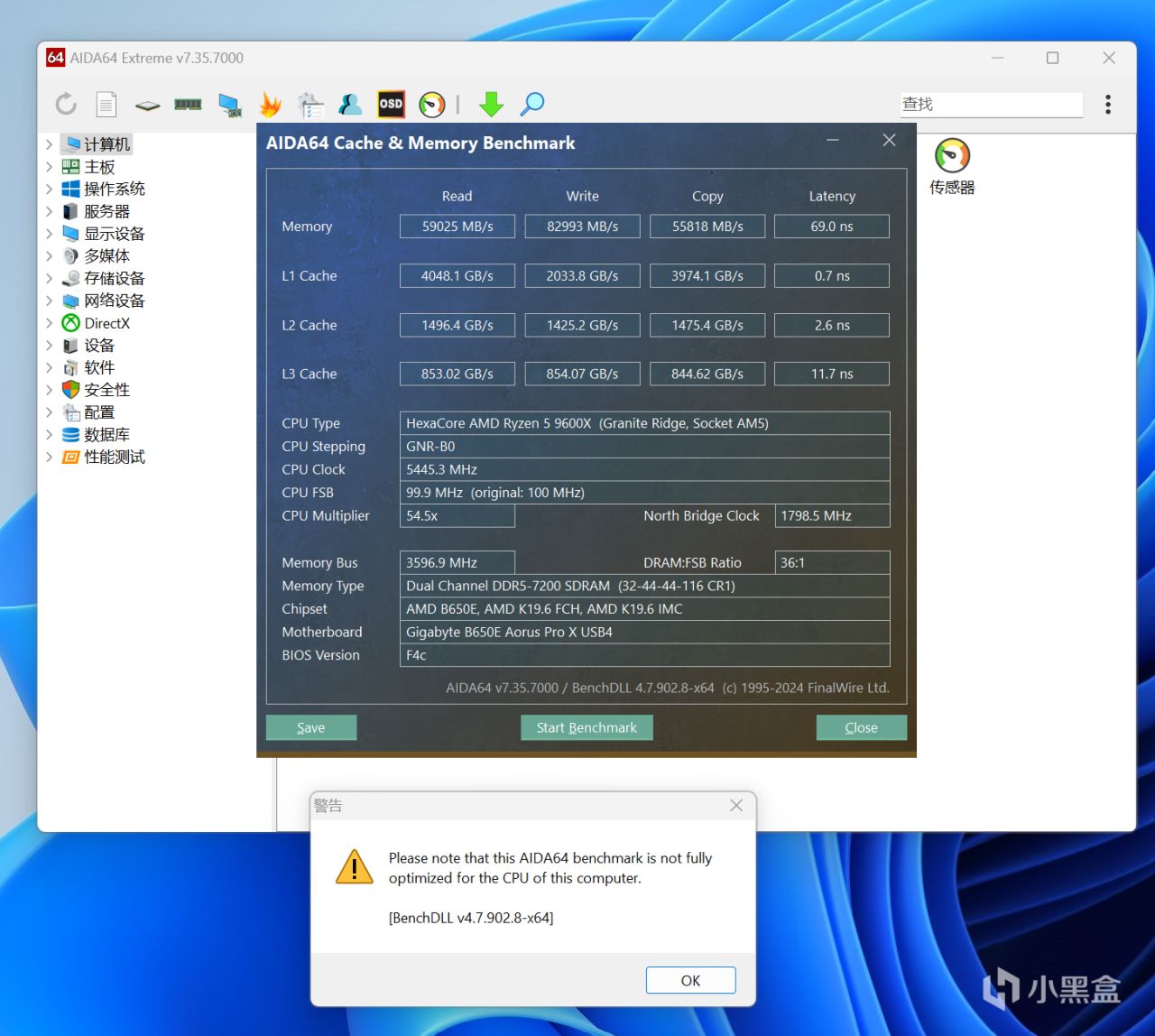 和以往一樣,銳龍處理器在首發時對於AIDA64軟件(最新版本)支持並不完善,跑內存和緩存時直接會彈警告框,所以硬核會用PerformanceTest內存測試部分,作爲不同內存頻率之間的參考性能對比項目,下面先來看看銳龍5 9600X三種不同的DDR5內存超頻方案。