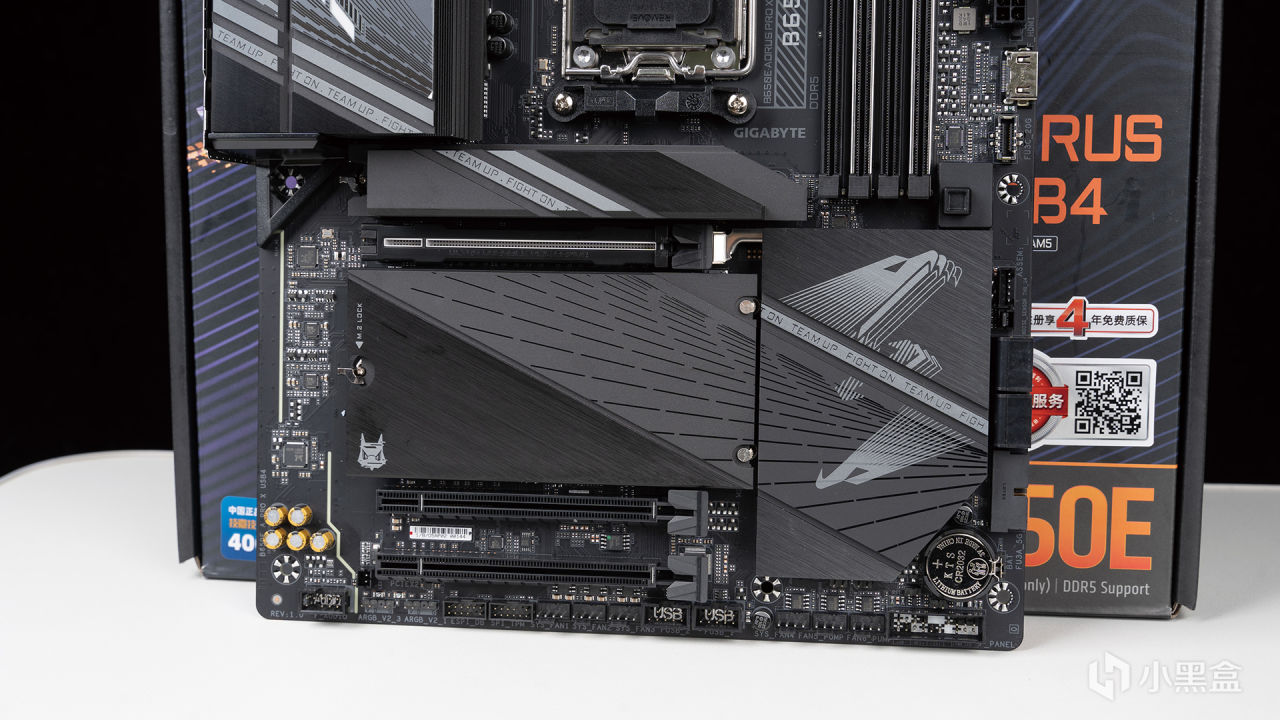 供電和內存超頻強是一大優勢賣點,另一方面B650E電競雕的擴展性也是相當不錯,它提供了三組M.2 PCIe 5.0X4和一組PCIe 4.0X4 M.2插槽,存儲支持相當超前和全面,所有插槽均覆蓋散熱裝甲,當然由於B650E芯片組限制,會和其他擴展槽共享帶寬,具體可自行查詢。第一組加固的顯卡插槽支持PCIe 5.0X16,其餘兩個插槽分別支持PCIe 4.0X4和PCIe 3.0X2。