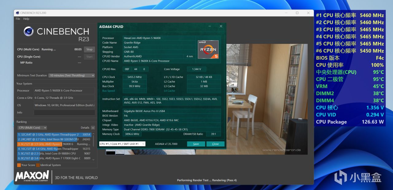 銳龍5 9600X設置PBO 2激進調教(10X,200MHz,PBO Limits=Motherboard)運行十分鐘CINBENCH R23多核項目,全核心穩定5460MHz左右,核心電壓1.35V,CPU Package功耗126W,CPU二極管溫度95℃