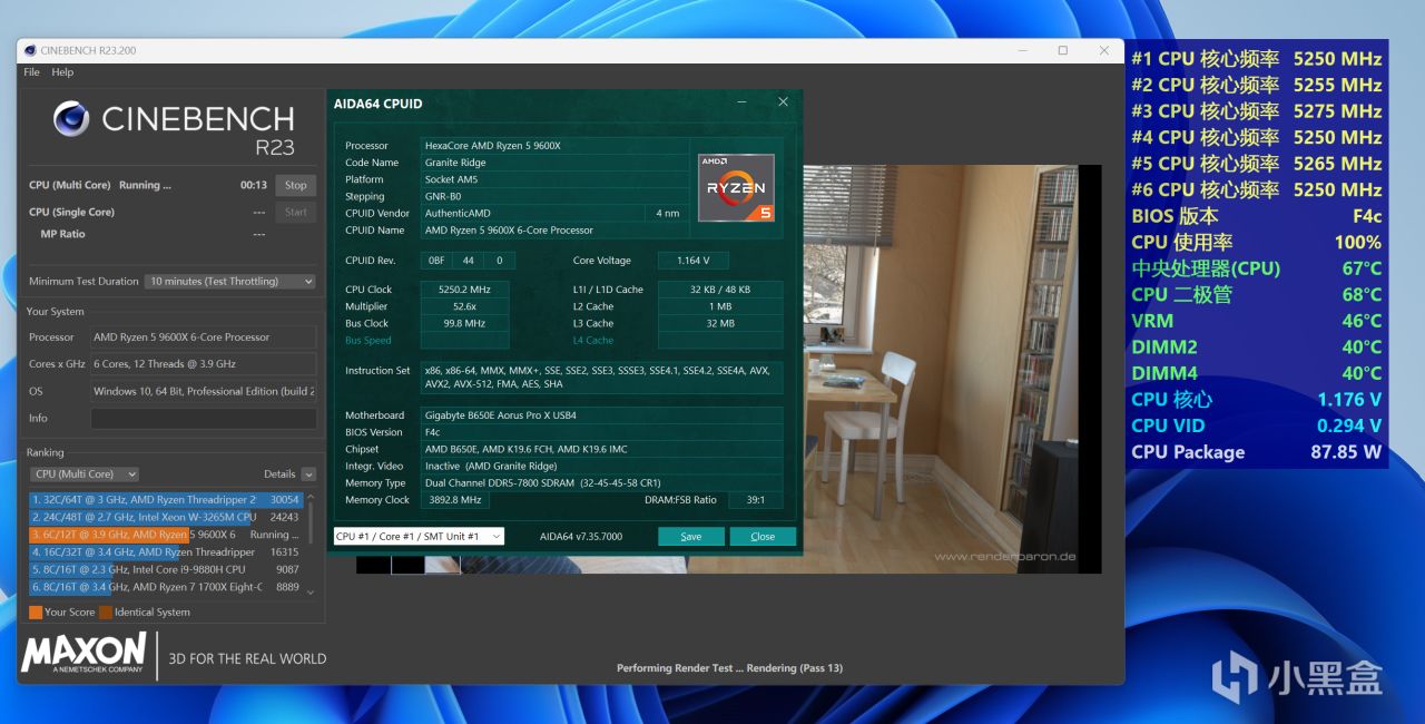 銳龍5 9600X設置PBO 2保守調教(10X,200MHz,負壓30)運行十分鐘CINBENCH R23多核項目,全核心穩定5250MHz左右,核心電壓1.176V,CPU Package功耗87W,CPU二極管溫度68℃