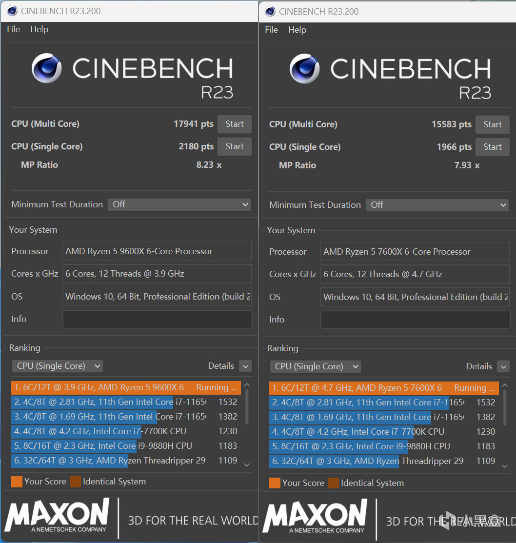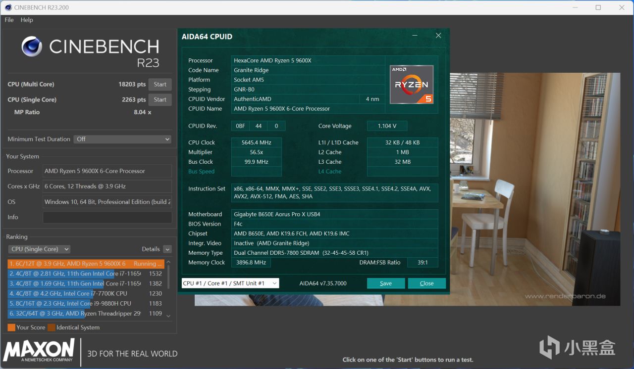 來到真正的渲染項目CINBENCH R23,銳龍5 9600X單核2180 pts,多核17941 pts,對比7600X分別提升了10.8%和15%,相當貼合官方所說的16% IPC幅度,而對比藍廠來看,這次銳龍9000性能調教顯然針對單核方面,開PBO就能把i7壓一頭了。