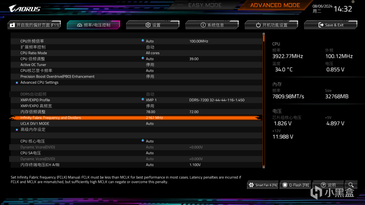 當然對於不想折騰內存超頻的玩家,最好的選擇還是開啓XMP/EXPO一鍵超頻,對於技嘉B650E電競雕這款主板而言,在XMP/EXPO基礎上它也有自家的D5黑科技超頻技術——XMP/EXPO高頻寬,開啓後不會調整內存頻率而是優化小參,性能提升和穩定性都不錯。