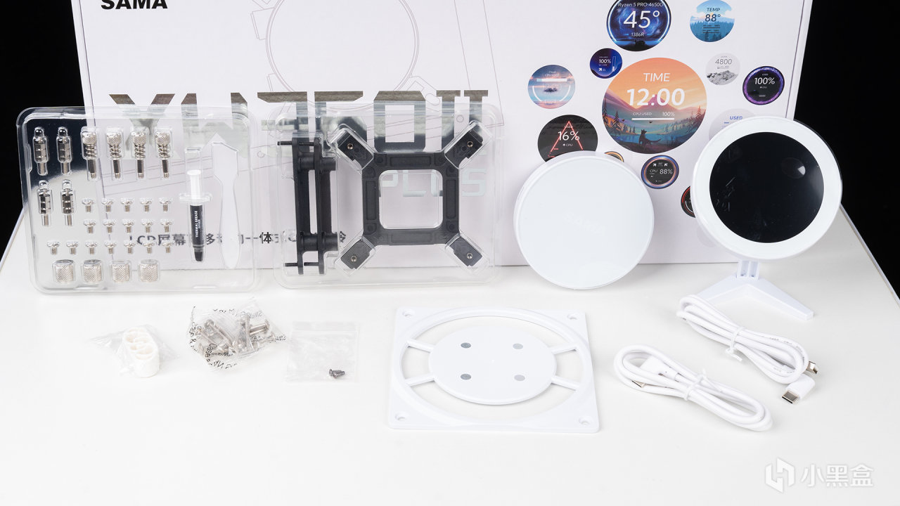 大多數配件都被固定在一個專門設計的PVC模子裏, 取出和放置都很方便,另外從配件中能看到,這個屏幕不止是能吸附在水冷頭上,而且可以搭配支架放置在桌面或者風扇中間部分,玩法比較創新,而且先馬還配備多一個帶LOGO的水冷頭配件,這可不是爲了取下屏幕還能保持冷頭美觀性嘛。