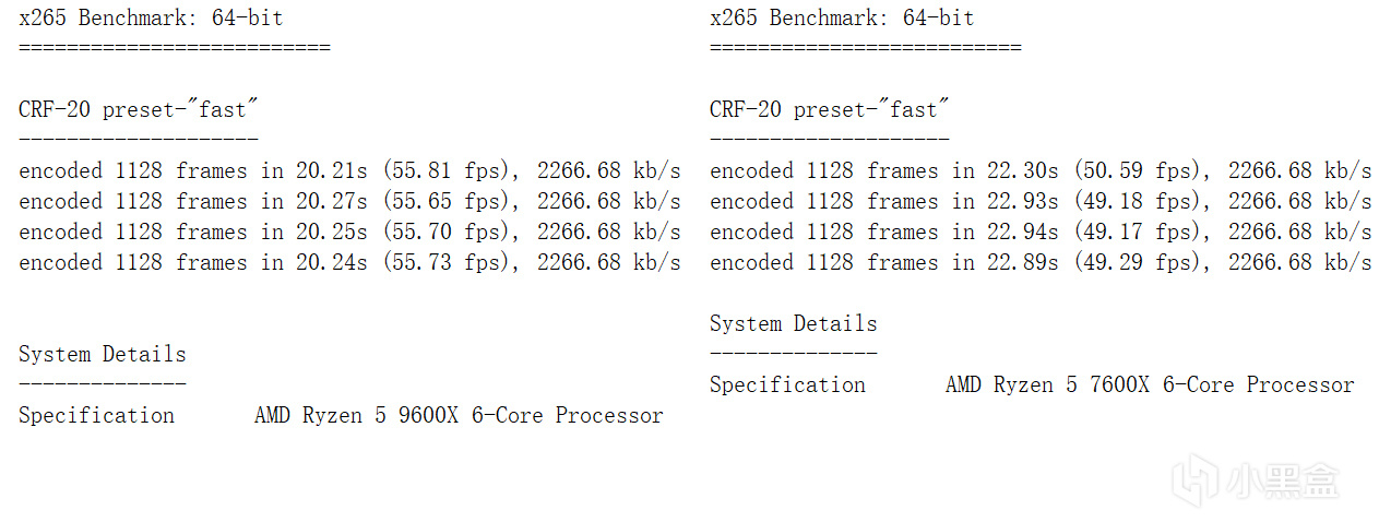 X265 HD編碼測試,銳龍5 9600X相比7600X會有大概2秒多的優勢,反映到百分比上已經是13%提升幅度並不小,但是對比藍廠堆疊小核的策略,生產力方面自然要弱一些。