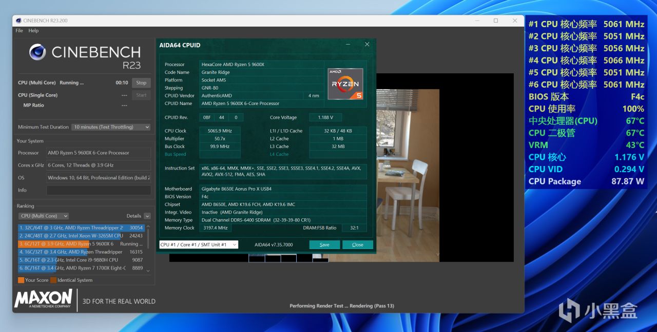 銳龍5 9600X默認PBO AUTO(Disable)運行十分鐘CINBENCH R23多核項目,全核心穩定5050MHz左右,核心電壓1.176V,CPU Package功耗87W,CPU二極管溫度67℃