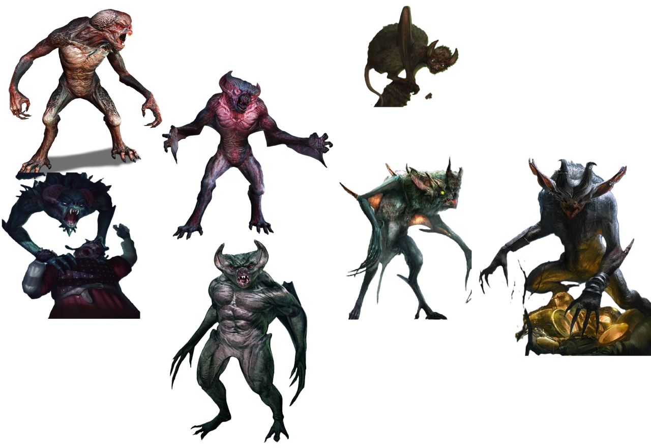 较为低级的:血魔、蝠翼魔、原始蝠翼魔、丑瘤巨魔、普鲁马德、弗莱德等等等等......