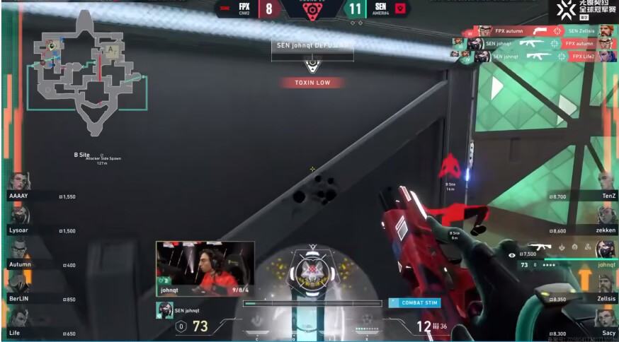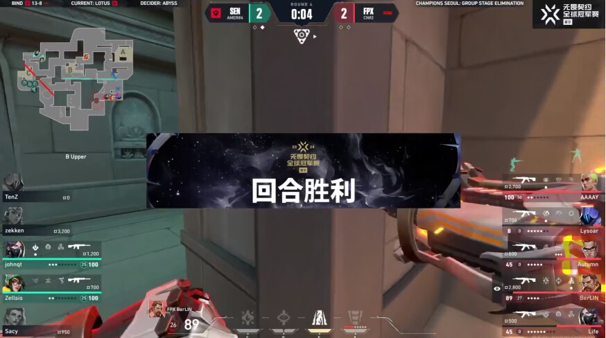 關鍵局FPX爆彈進B幹掉B點防守兩人,被SEN三人回防,johnqt殘局一穿2拿到了賽點。