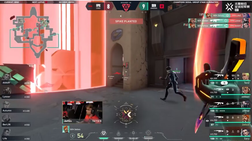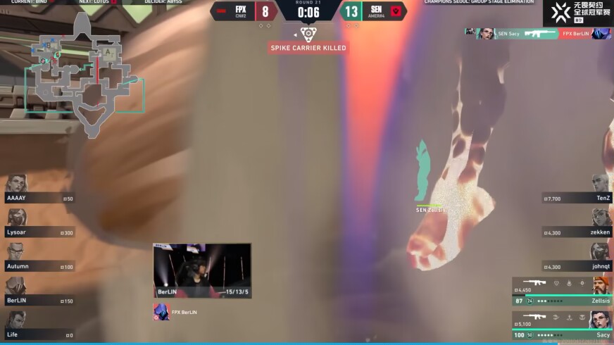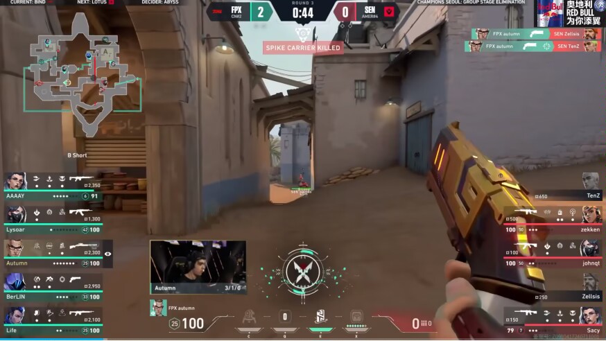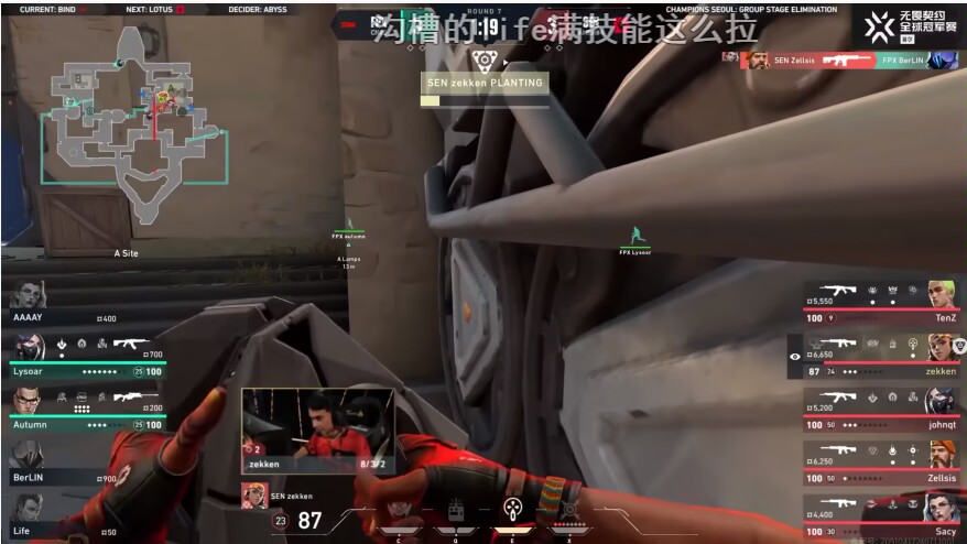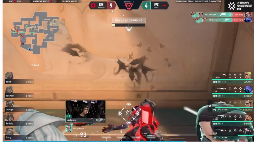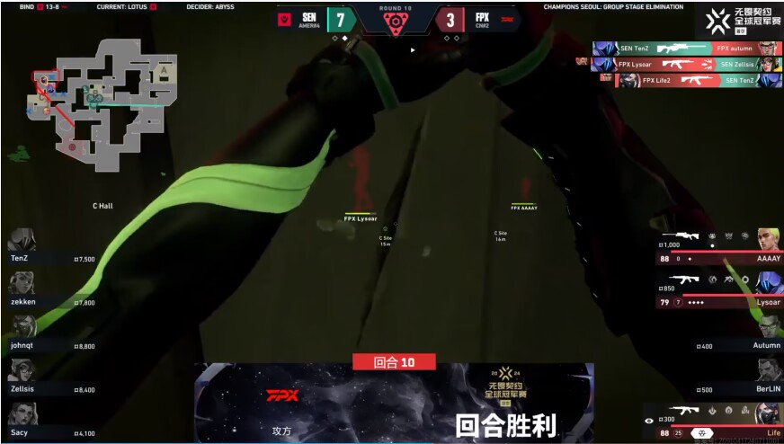 FPX防守開拿手槍局,SEN長槍局,autumnB點前壓打掉SEN兩人,FPX又在b點接住了SEN。直接起飛。