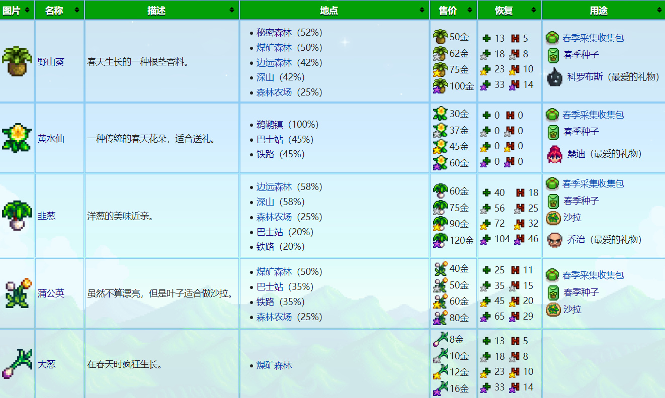 下图是春季常见的几种采集品,我在前期一般是野山葵、黄水仙、蒲公英拿去卖,韭葱和大葱留着自己吃(但要注意,野山葵、黄水仙、韭葱、蒲公英这四样采集品你至少每样留一个,后面做献祭要用到)