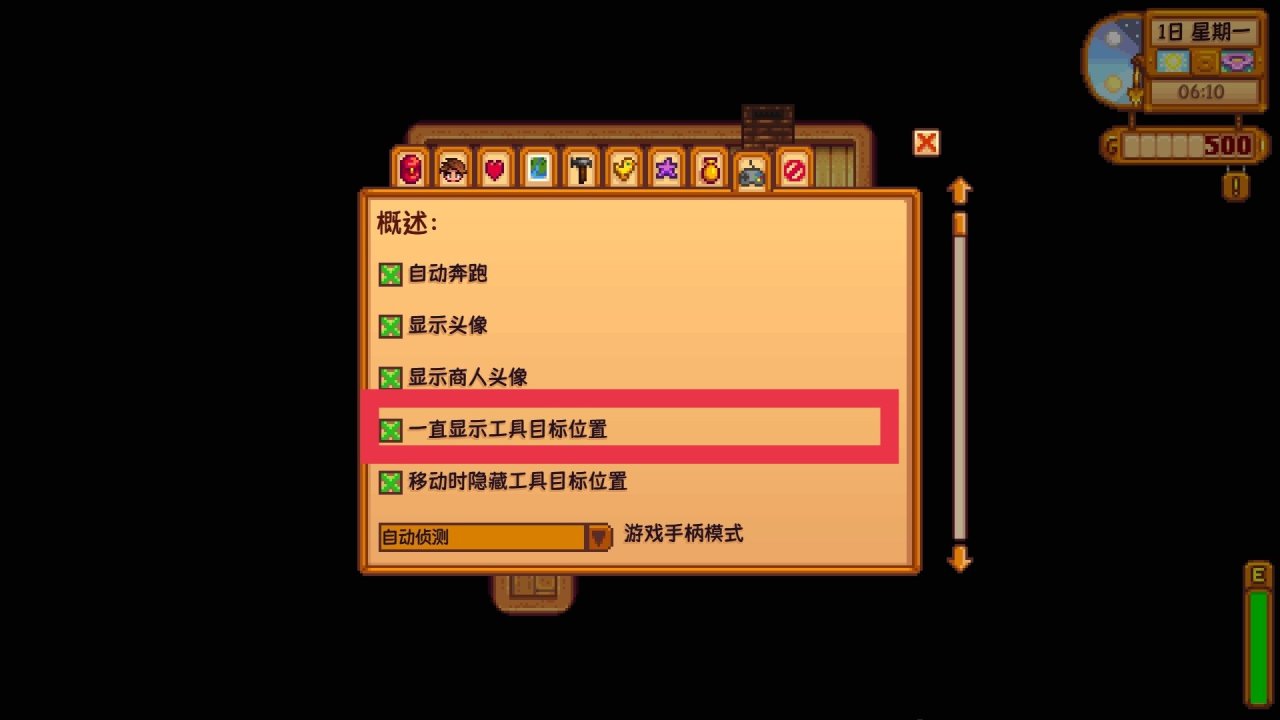 起床,WASD是上下左右移动,我们按Esc打开背包界面,选择选项,把“一直显示工具目标位置”选上,这个很有用,选择后我们就能看到工具的具体工作位置了