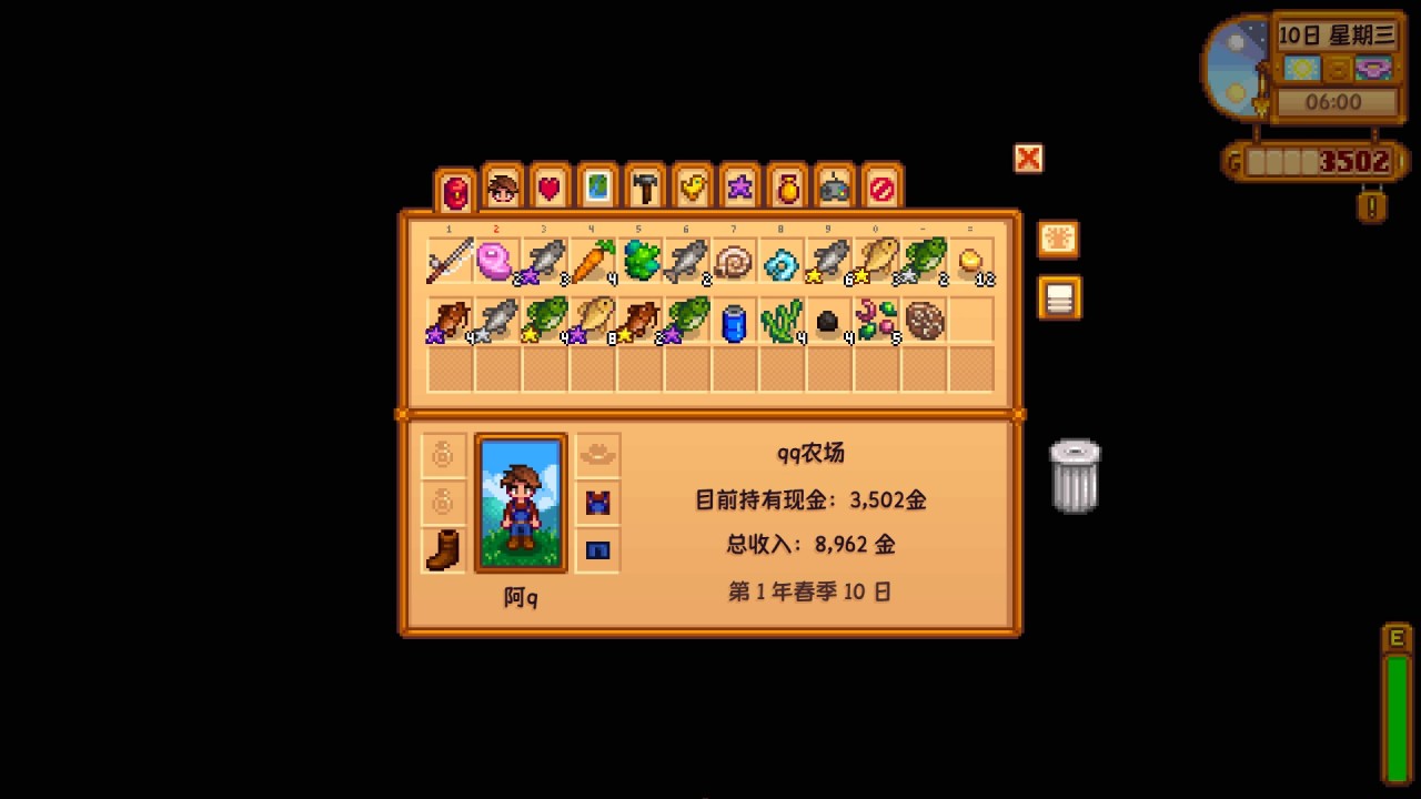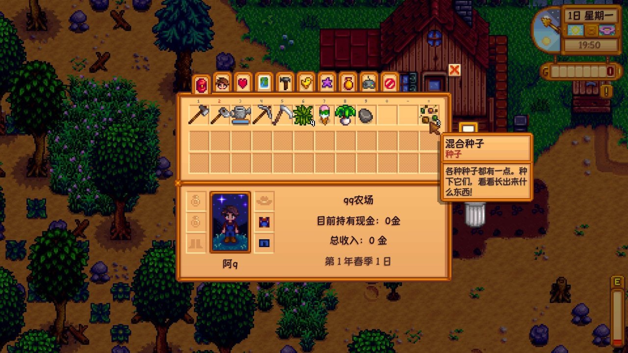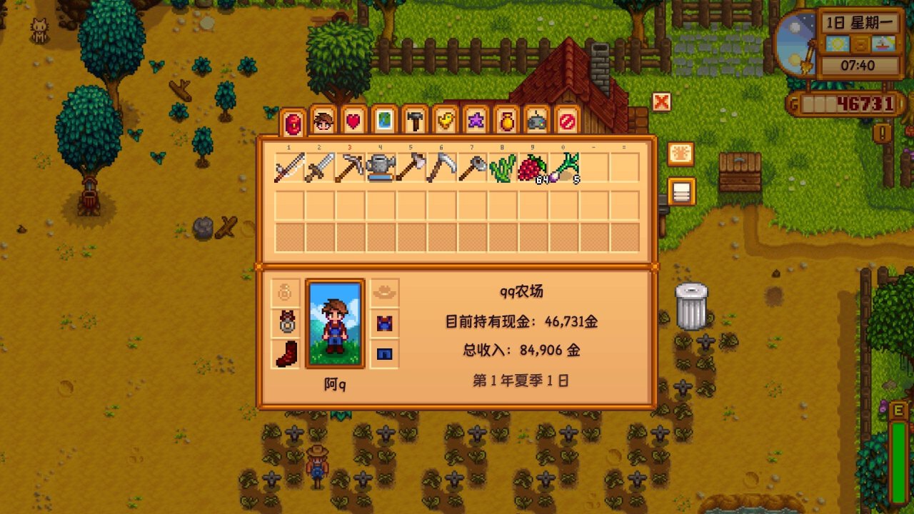 大家好,我是阿q,今天给大家带来一期新手第一年春季的游玩攻略,因为星露谷这款游戏几乎没有新手指引,这就会导致很多新手刚开始都不知道要怎么玩,包括我自己以前也是,所以本篇攻略的主要目的是让一些新手了解这款游戏,了解刚上手应该怎么玩,不至于玩不下去,本篇攻略走的酿酒流,但并非追求极限赚钱攻略,我本人也不是专业人士,在讲解过程中可能也会踩坑,欢迎更多大佬在评论区补充可以完善的地方!