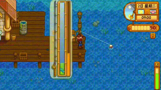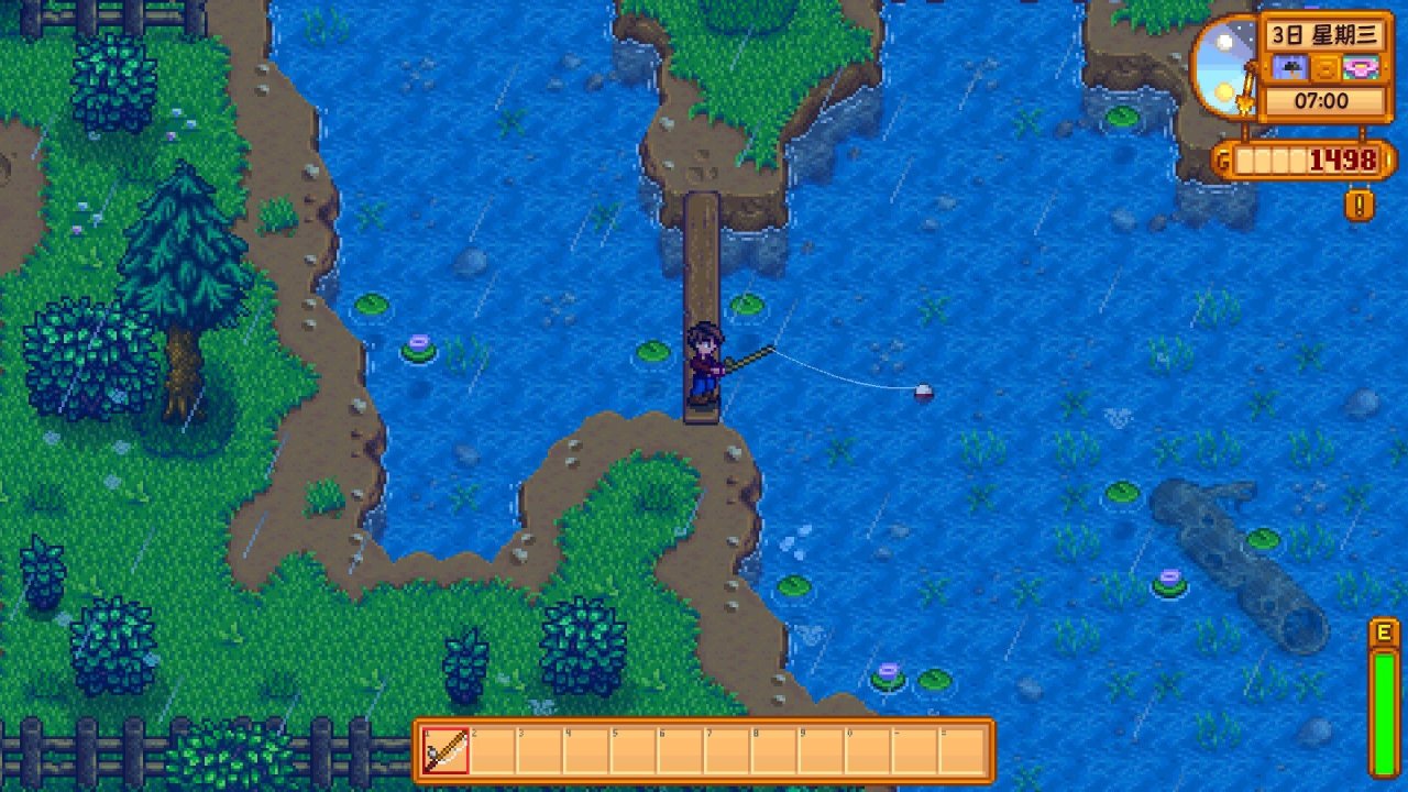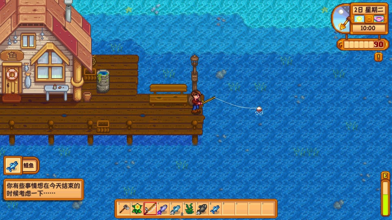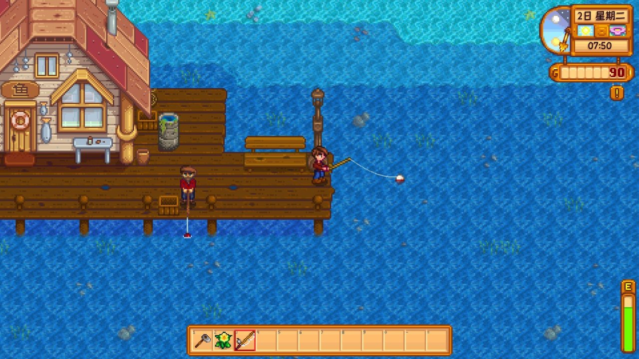 到达海滩后,会触发一个剧情动画,威利会送你一个竹鱼竿,之后直接按照我下图所在的位置钓鱼就行,这个是一个金星钓点,钓鱼等级一级就能钓到深水区,这会让你钓到鱼的星级略高一点,星级越高的鱼,金钱价值和食用价值就越高,在钓鱼途中钓到海草的话,等没体力或背包满时就吃,如果你背包满了在下午5.前可以直接把鱼拿到旁边的鱼店卖,5.后背包满了你可以直接丢在地上,鼠标点击一下物品就能拿起来,拖到物品栏外点击就能丢出去,只要你不退出游戏,隔天这些掉落物是不会清空的,到时你第二天再来捡就行