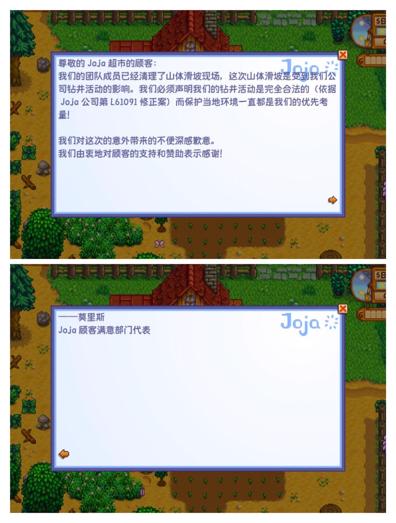 全部选择完成后,我们点击信息界面右下角的ok就能进入游戏了,简单介绍一下开场的这段剧情,我们主角的爷爷在星露谷有一个农场,他临终前把那块地的契据交给了我们,让我们在以后深处困境时再打开,若干年后,我们在Joja公司上班,感到生活疲惫,自己已经要被工作压垮了,这时我们想起爷爷交给我们的信,于是我们打开这封信得知了信息,之后我们辞去了Joja公司的工作,来到星露谷开启崭新的人生,星露谷就像一个别样的世界,很多新手玩不进去就是因为好比自己刚来一个陌生的地方,人生地不熟,会抵触,后面慢慢了解熟悉这里的人和文化后,你就会融入进去,这些都是后话了,至于后面我们初到星露谷时还有一小段剧情,刘易斯是鹈鹕镇镇长,罗宾是木匠,大家记住屋子右边那个箱子是出货箱,不是存储箱就行