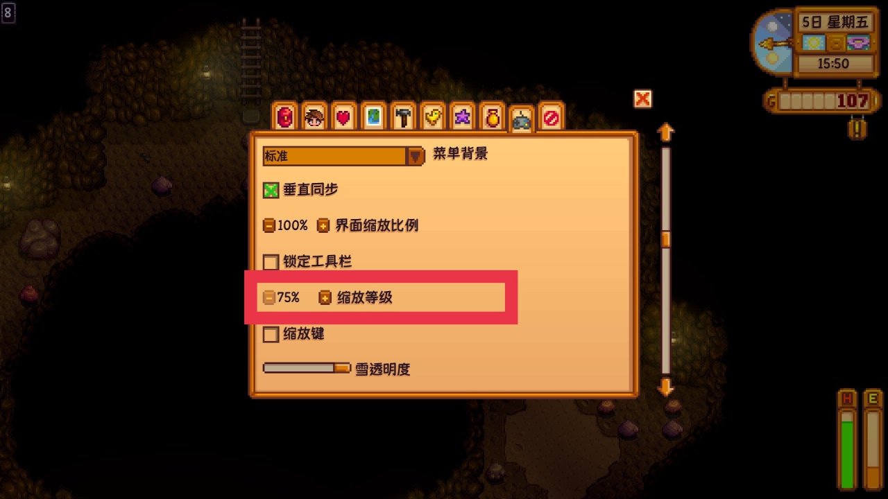 初次进入矿洞,会触发一个剧情动画,马龙会送你一把生锈的剑,之后你与楼梯互动就能开始下矿,下面我简单介绍一下矿井,矿井每五层会记录一次电梯,你再来就能坐电梯直接下到你最后到达的层数,可选层数为五的倍数,我们目前的主要目的是在矿井刷铜矿石和铁矿石,它一共有120层,铜矿每层都有概率生成,铁矿在40层后生成,金矿在80层后生成,我们敲碎矿石或石头都有概率会碰到梯子,点击一下就能到下一层,平均每十层都会有个宝箱,里面大多是些装备,大家拿到就用,基本越往下的装备越强劲,大家在下矿前可以到选项把下图标记的“缩放等级”从100%调到75%,这样在下矿时的视野会更广,不容易遗漏矿物