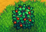 起床看电视浇水,之后去挖矿,用电梯反复上下矿井21层去刷铜矿,凑齐5个铜锭后直接拿到铁匠铺升级十字镐(其实14日当天拿完铜斧头后无缝衔接升级铜十字镐是最好的,但大家毕竟是新手,可能连25个铜锭都不一定凑齐,所以我这里拖了一天),去铁匠铺选择升级后,再到皮埃尔杂货店买防风草种子拿回去种,我这里是买了50个,因为要刷金星防风草,在路上你可能会看到下图这种红色灌木丛,看了离地而居节目的玩家应该知道,这个是美洲大树莓,每年春季的15—18日期间星露谷就会出现这种红色灌木丛,我们过去点击鼠标右键摇晃它就能获得美洲大树莓(用镰刀收割也会掉落),这个是食物,主要拿来吃的,不要拿去卖了