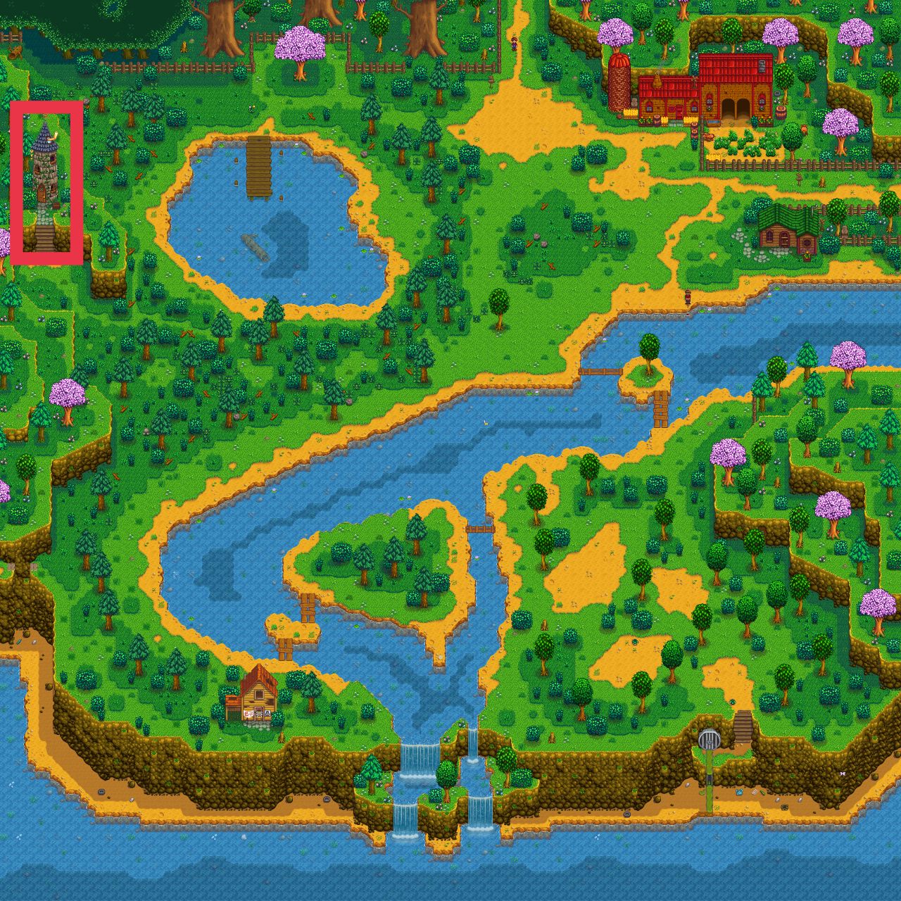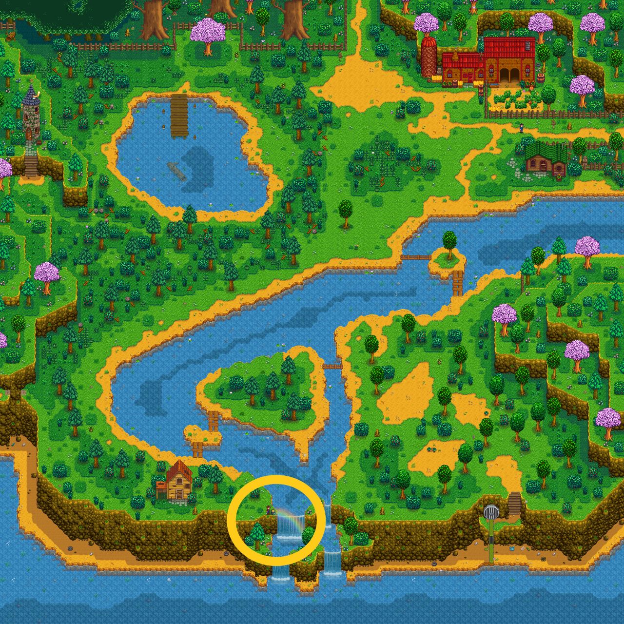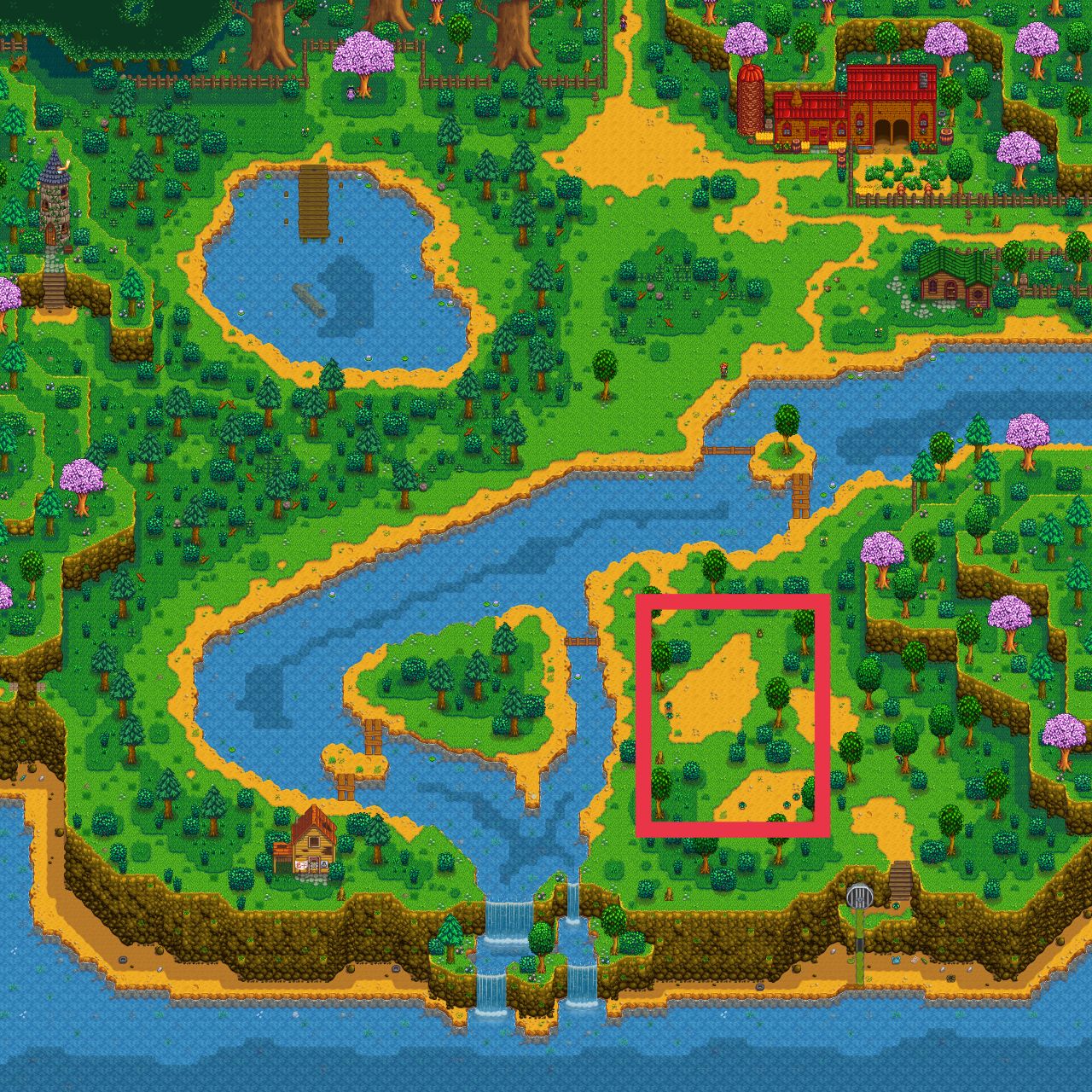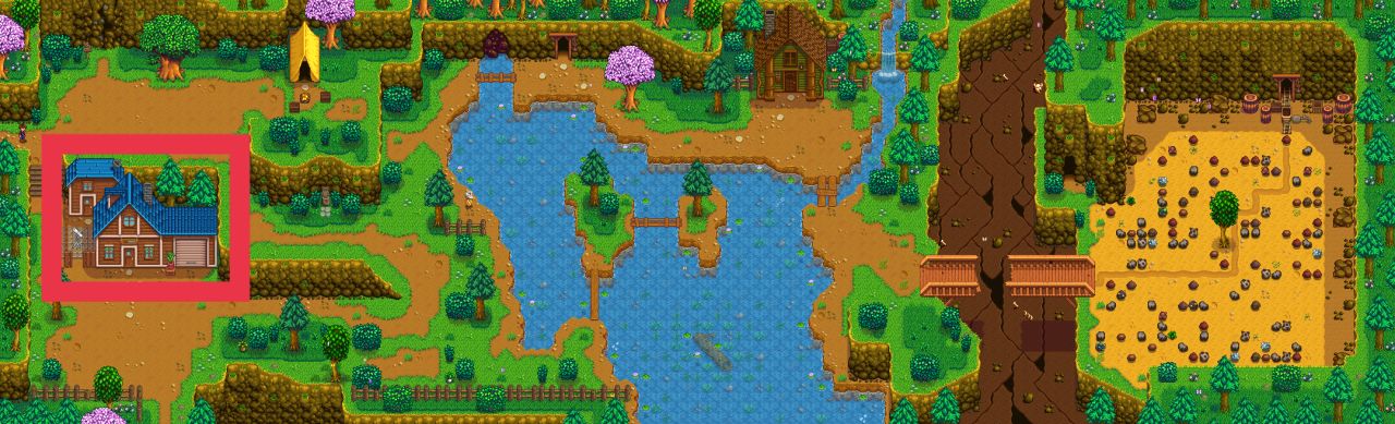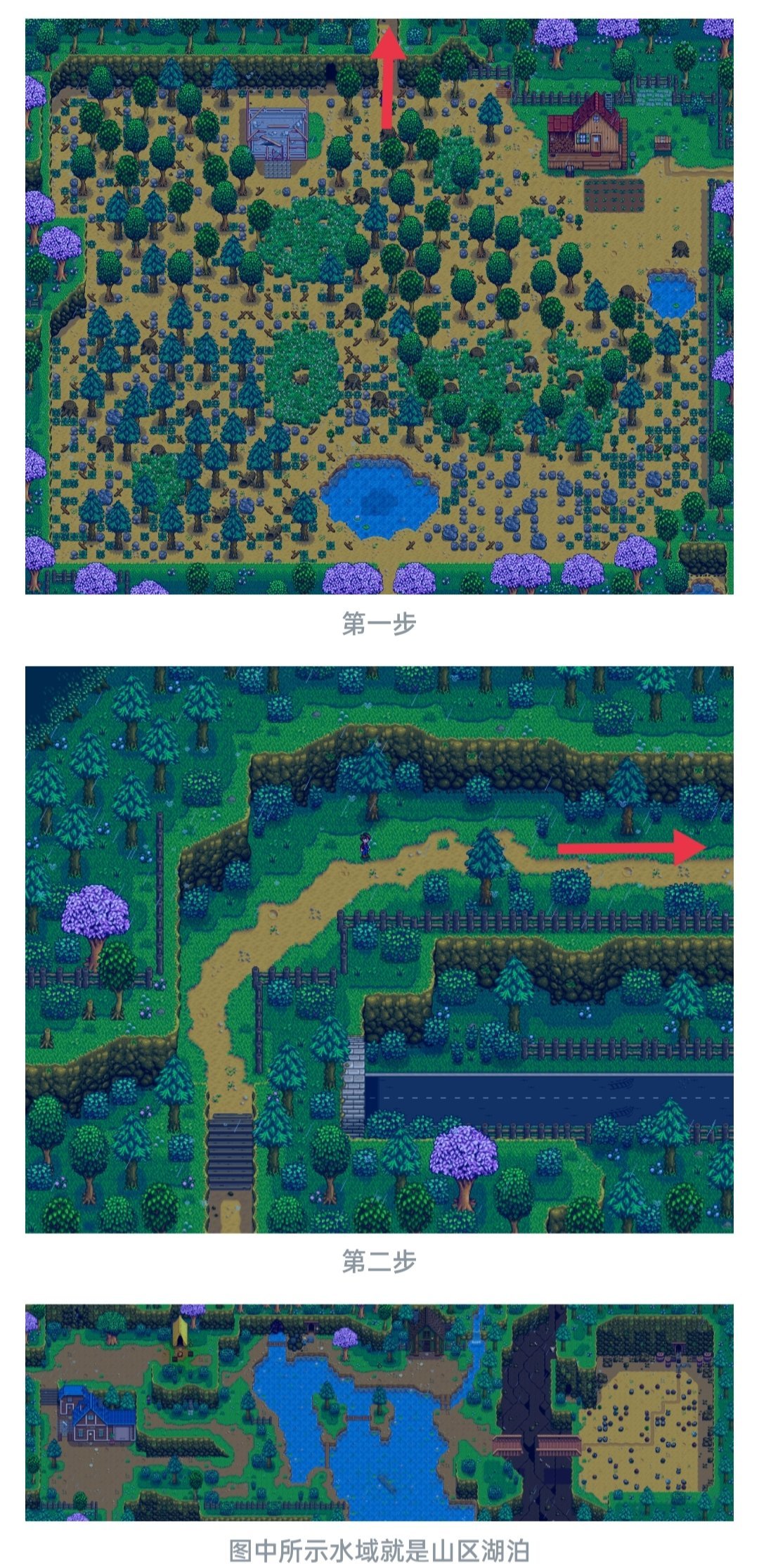 春季第三日是必定下雨的,所以我们不用浇水,起床看电视,看完电视以后清空背包只留鱼竿,到山区湖泊钓鱼,山区湖泊的具体位置如下图所示,大家跟着红色标记走就能到