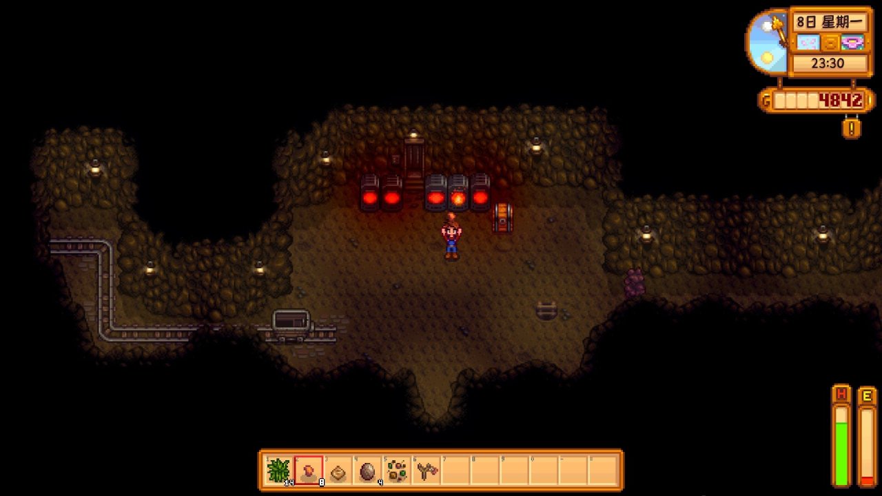 我们下矿的方式就是尽可能减少与怪物的纠缠,有矿物就优先采矿,没有矿物或矿物离的很远的话,就迅速敲石头找梯子(至少你要赶紧下到40层接触到铁矿,下到40层后可通过电梯反复上下21/31层刷铜矿,41层刷铁矿)