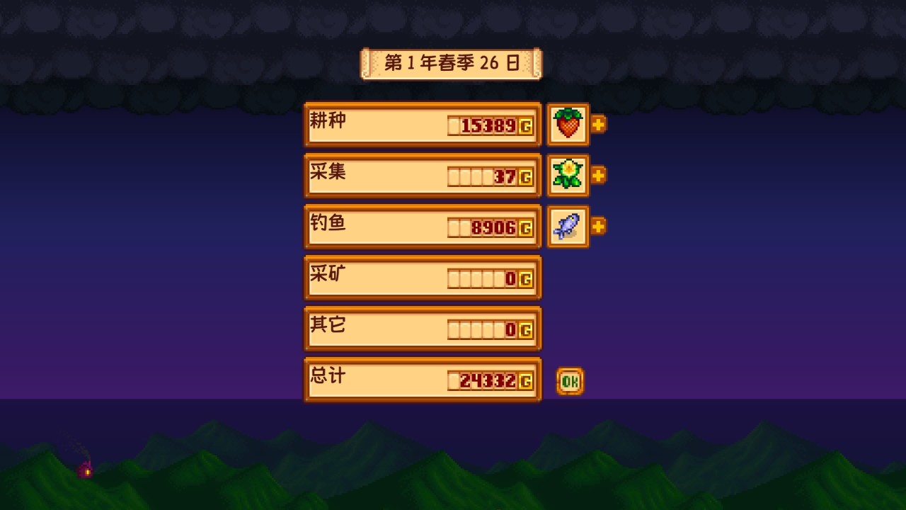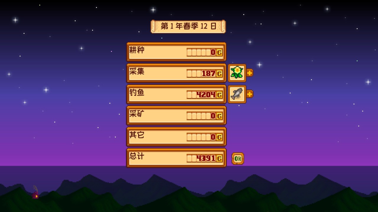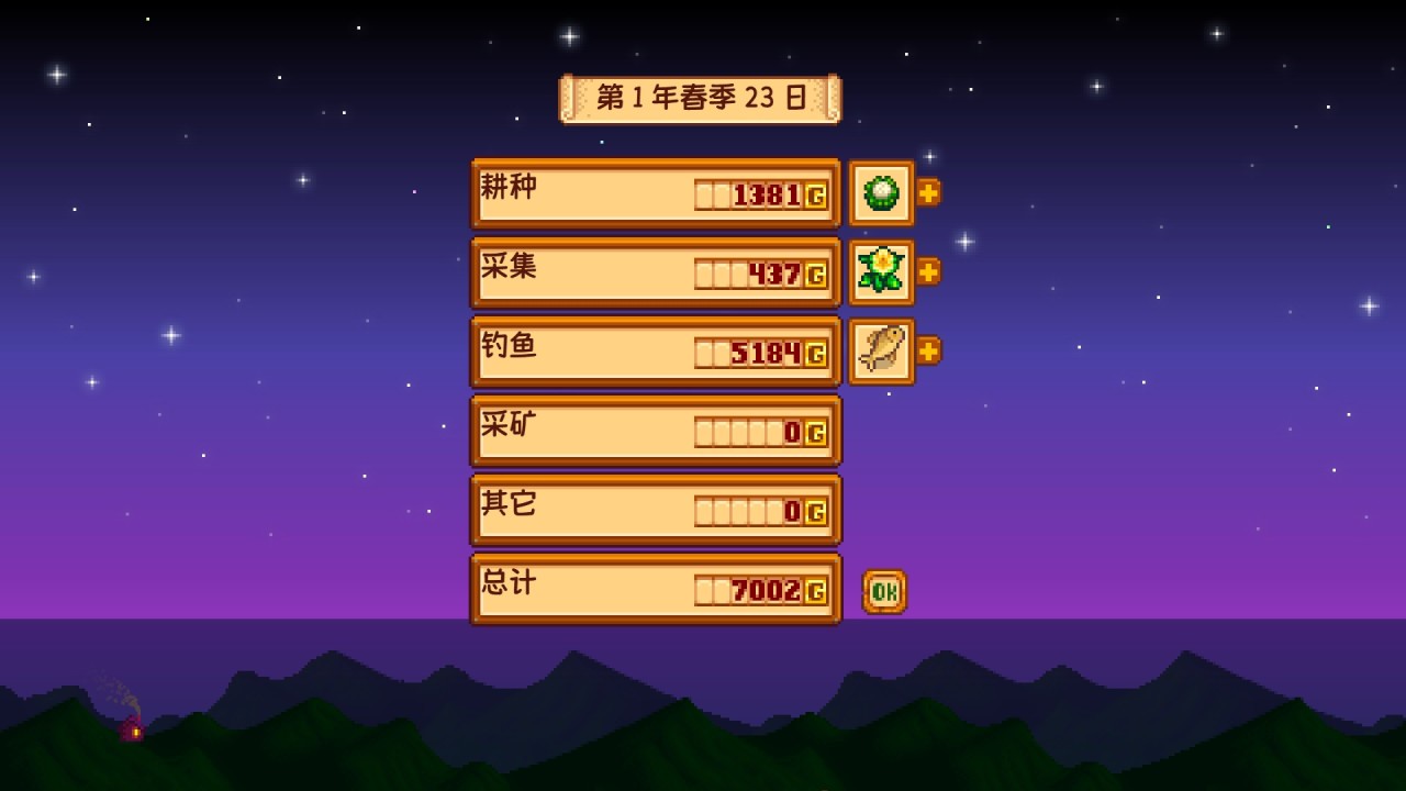 做完上述事情后,把剩余的鱼和农作物卖掉,接着挖挖矿,到处砍砍树,结束今天就可以了