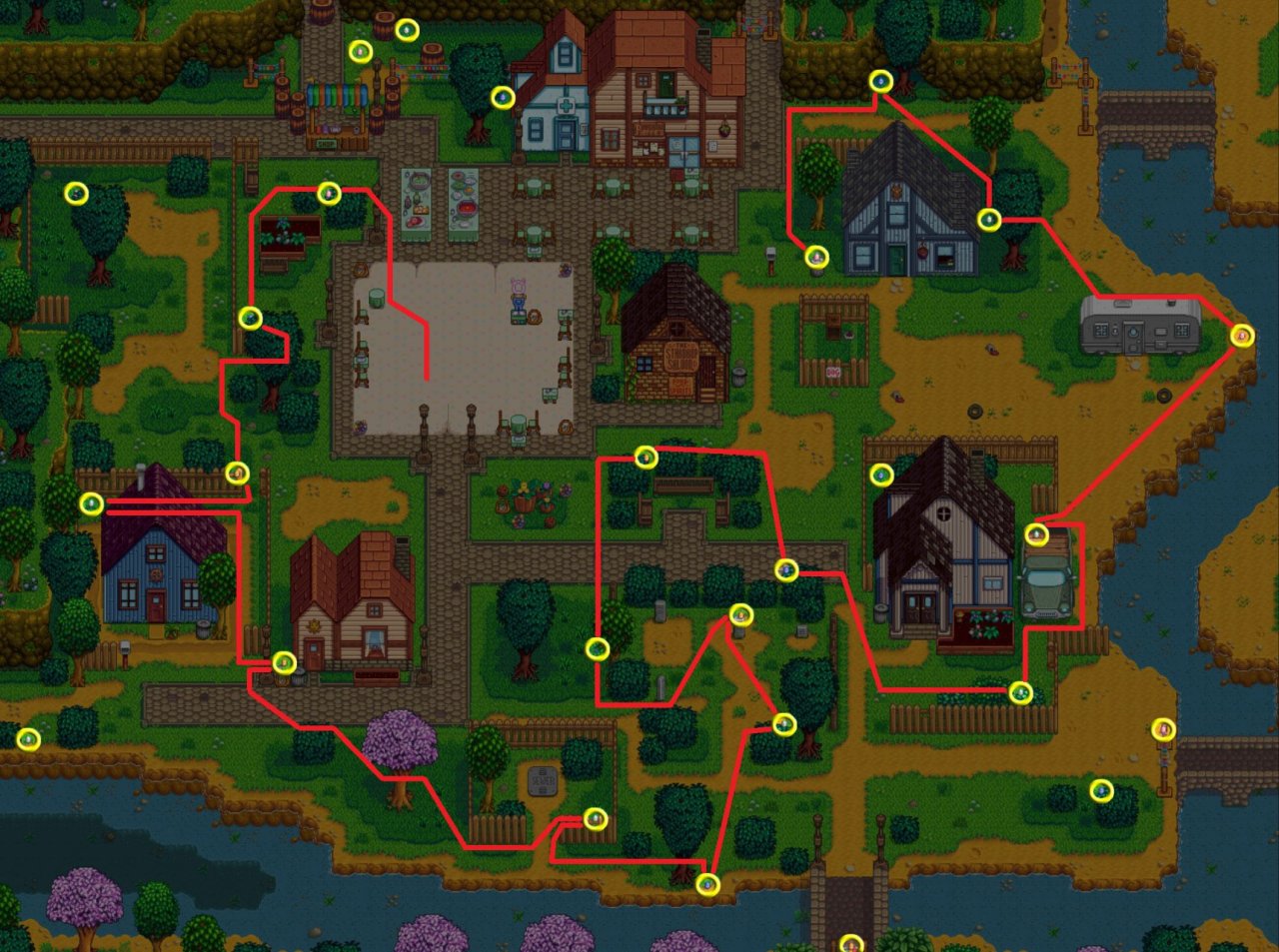 买完草莓种子后,大家可以去参加复活节,跟各个村民聊聊天(这里聊天也可以帮你做刚开始那个“介绍”任务),最后去与刘易斯对话即可参加活动,这个复活节活动就是找彩蛋,你找到9个彩蛋就能赢,奖励是一顶帽子,输了也没影响,大家可以参照下图的彩蛋位置去找,彩蛋活动结束节日也会随之结束,你会回到屋子门口,时间是晚上10.,这时直接去睡觉就行