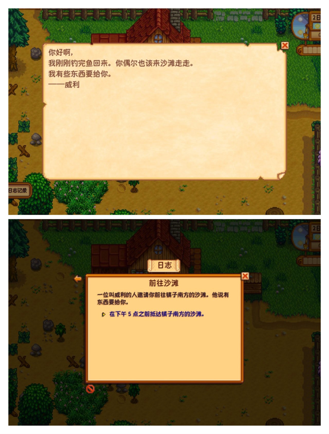 起床,看电视(要养成每天看电视的习惯,不管今天有没有用,总之你一定要看),看完电视后出门给农作物浇水,浇完水后阅读旁边邮箱的信,会触发一个任务,威利叫你去海滩