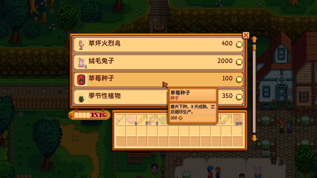 (你也可以直接梭哈,把钱全用在买草莓种子上,但我这里不推荐,因为25个铜锭➕25铁锭目前就是只为100个草莓种子做规划的,多出的你就得自己浇水,看各位自己取舍,我个人觉得100个草莓差不多了,而且我这留的3500金后面还会有别的用处)