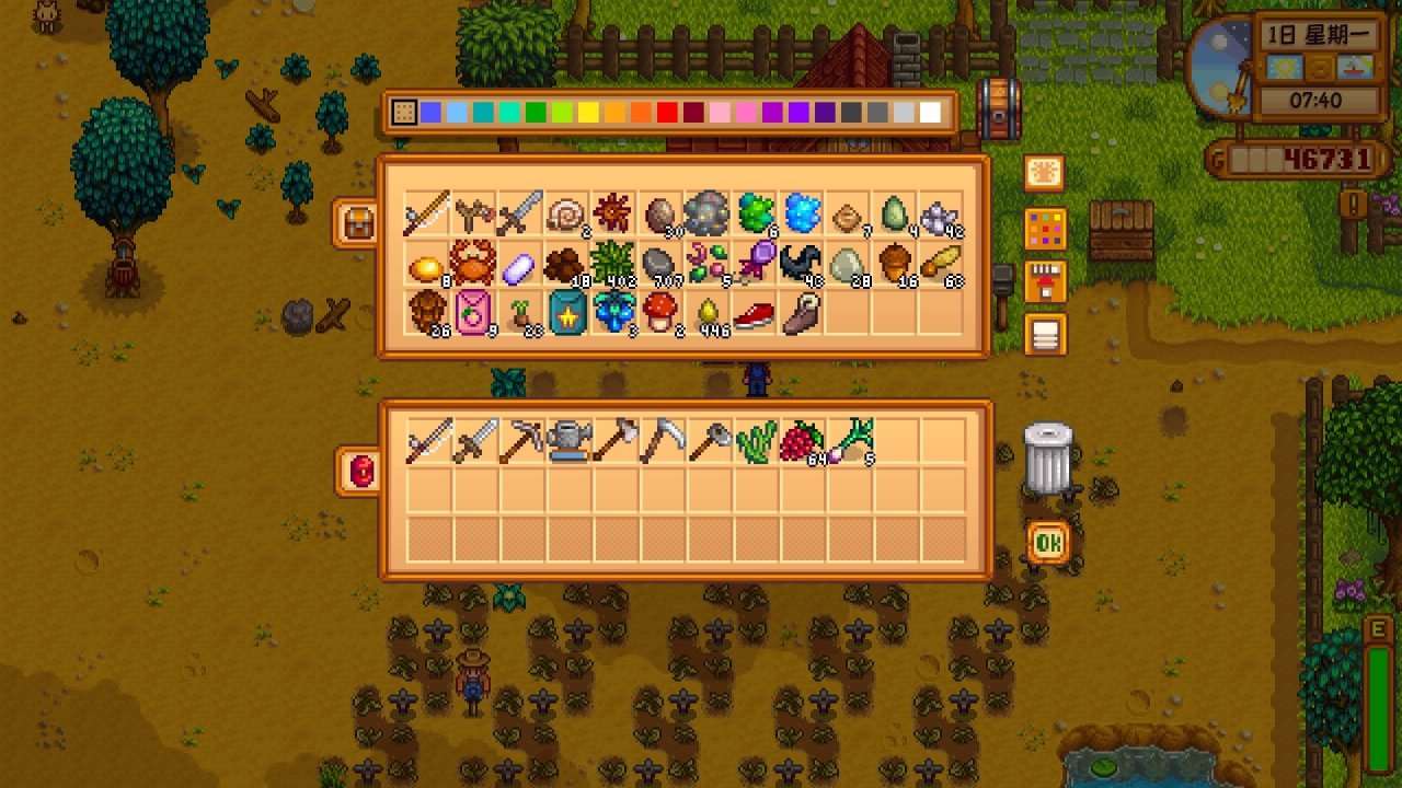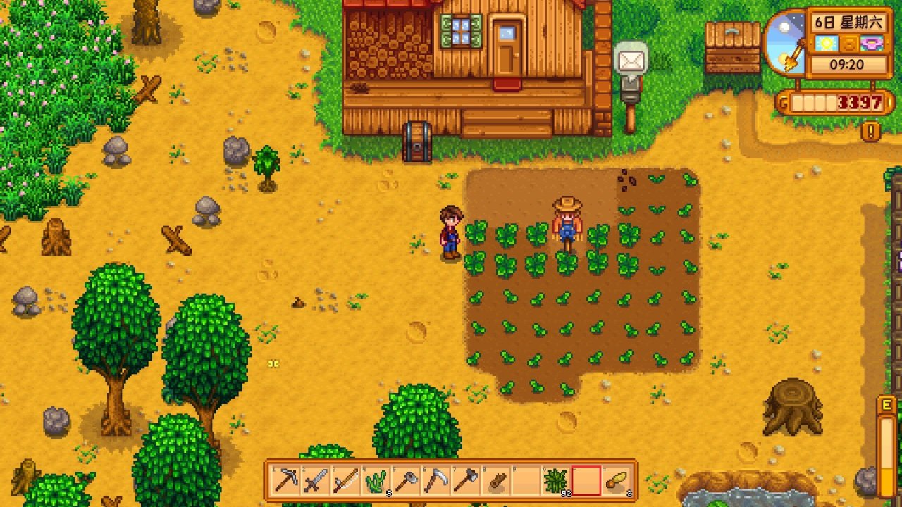 最后讲一下第一天的收尾工作,晚上7.左右回到农场(凌晨12.前睡觉可以恢复所有能量,所以你凌晨12.前一定要睡觉,大家根据自己时间安排),如果你在清除杂草的过程中获得了混合种子,那就全种下去,记得浇水,还剩能量的话就去砍砍树把能量用完,把上述采集到的物品放入出货箱里出售,没采集到也没关系,之后回屋子里睡觉即可