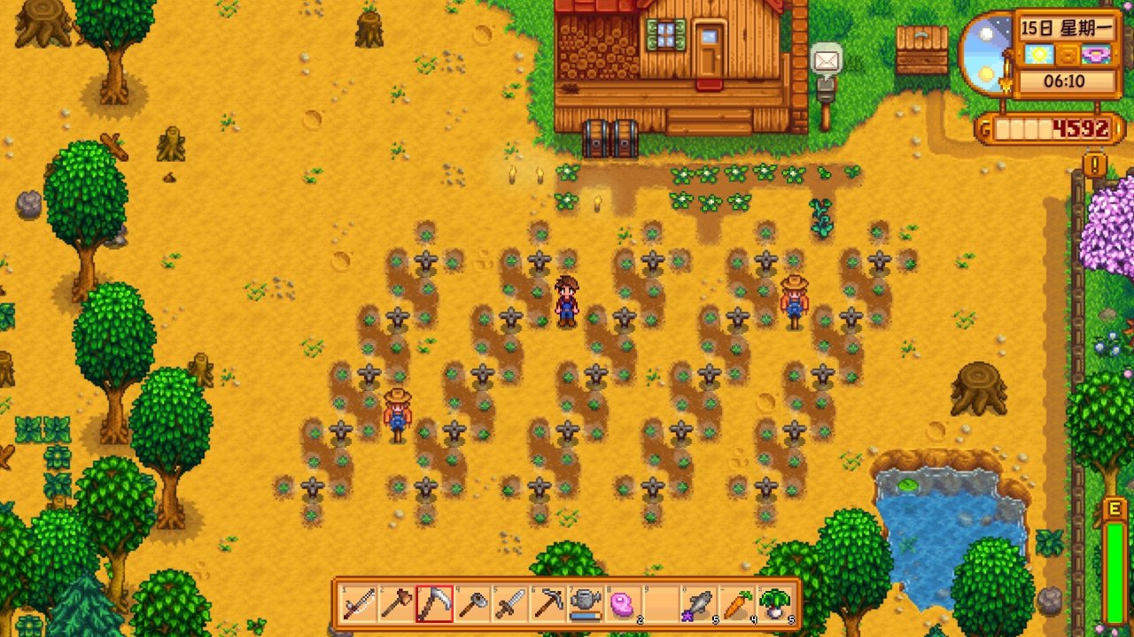 我这个开局就算是挺舒服的了,基本春21日后就能自由安排时间,总之大家记住十字镐和斧头是最重要的,按照我这开局来的话第一年可以把十字镐和斧头都升成钢的,就算你第一年春的树液采集器很少,这两样工具的升级依然可以有效提升你后面的游戏体验,下矿和砍树都很舒服,至于其它工具都没有升级的必要,其实我们第一年春季的工作都是为了夏季酿啤酒花做准备,大家如果进度落后也没关系,慢慢按照这个思路去玩就行,做树液采集器挂橡树,20个左右即可,之后就是好运天下矿,霉运天砍树➕钓鱼