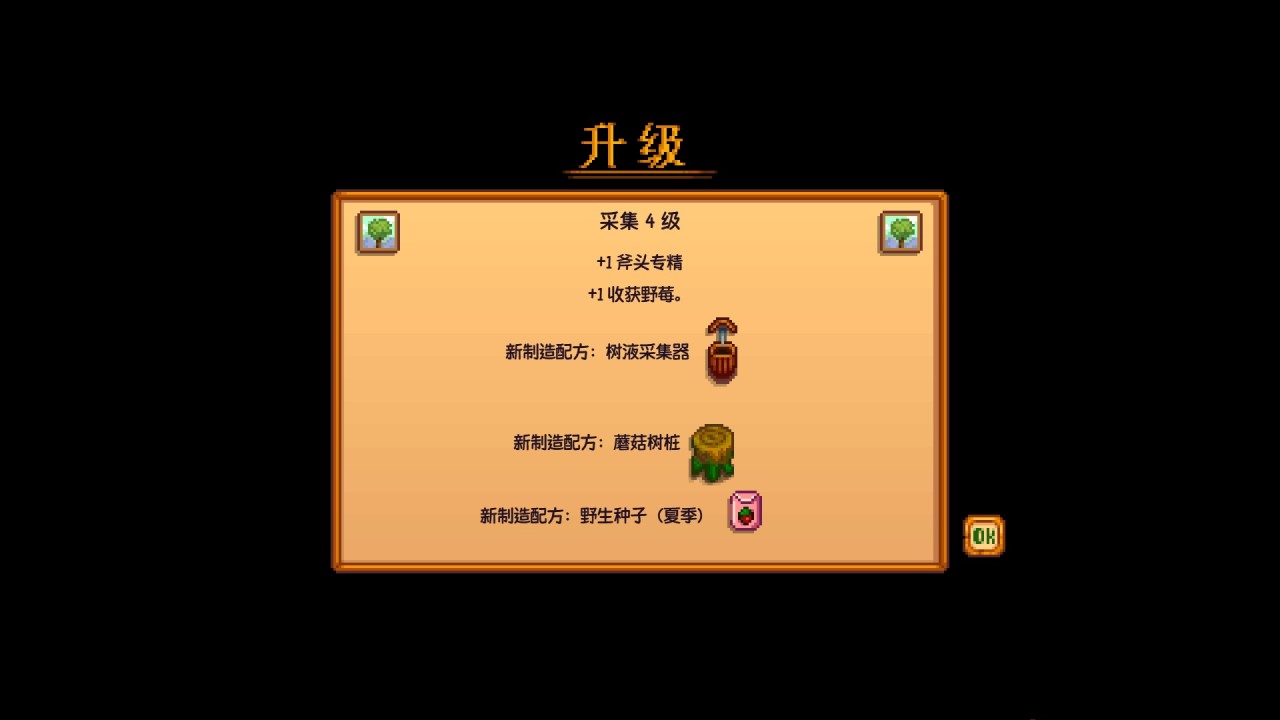 做完上述工作后,我这里是下午5.30,大家带上铜斧头去煤矿森林区域先砍树,没体力就去找美洲大树莓和采集物,晚上10.左右回家睡觉即可,上述这些行为都可以获得采集经验,我们得去提升一下采集等级,升到四级解锁树液采集器的制作配方