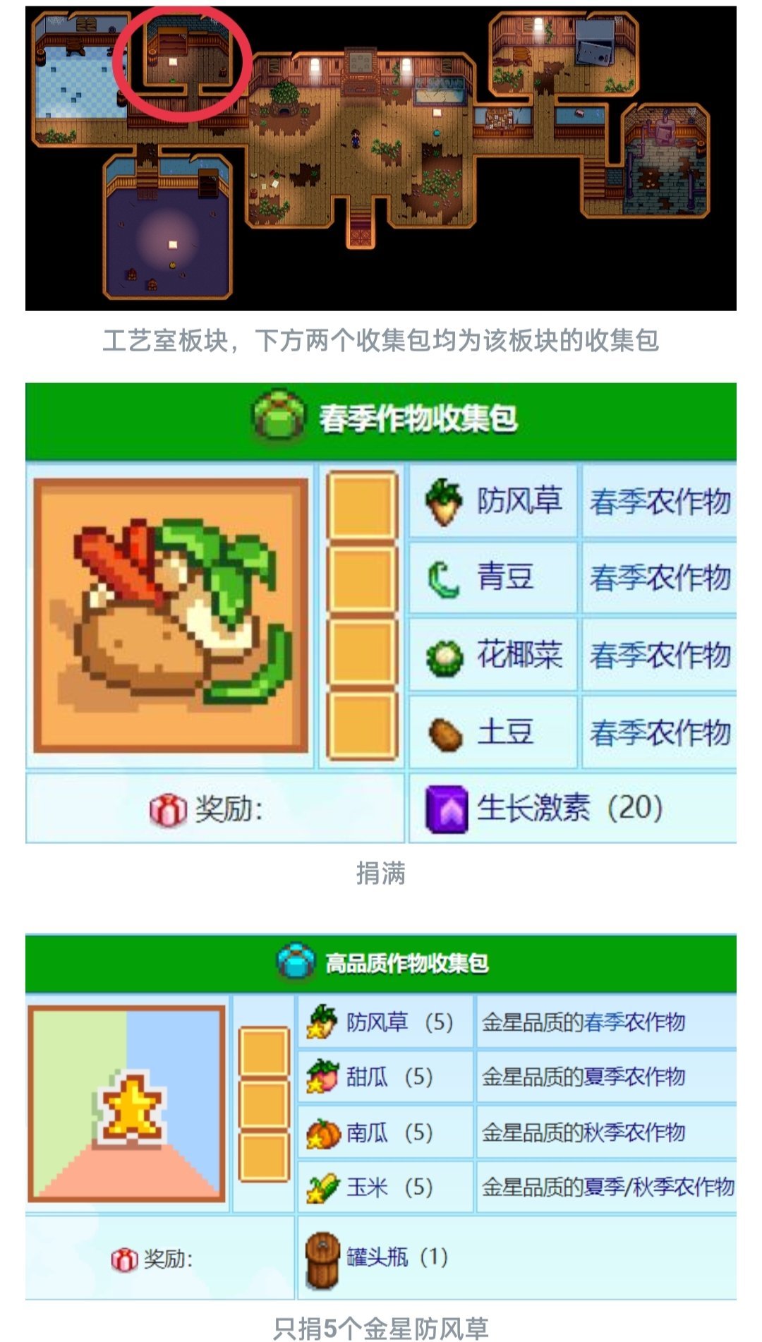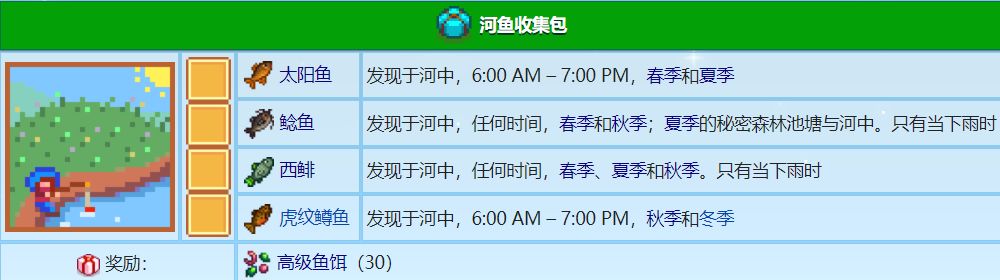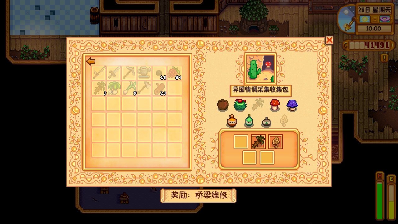 最后拿着春季的四种采集物到社区中心,把四种采集物放入框框内就能完成春季采集收集包,你会获得30个春季种子作为奖励,回农场全种上即可结束今日