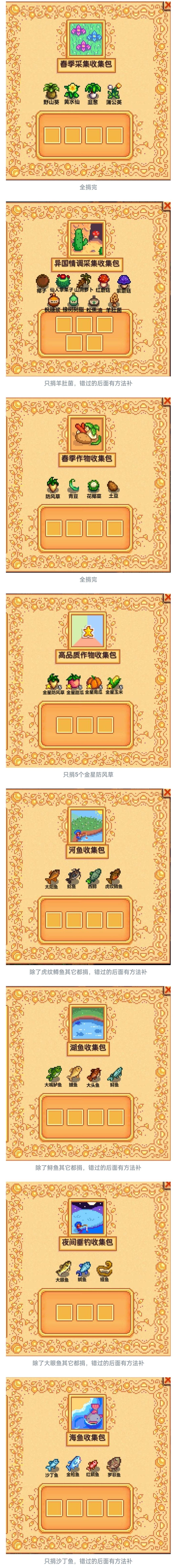 今天是春季的最后一天,大家如果有没做的献祭收集包记得去做完,下面我把春季该做的献祭收集包列出来(按照我步骤走的玩家应该是都捐完的,没捐完的可以去补一下)