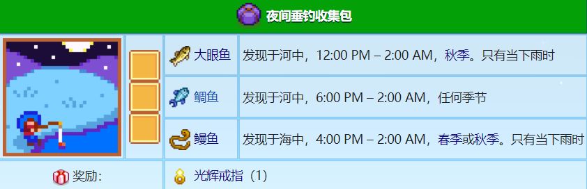 起床收最后一波草莓,放到出货箱出售,基本目前就没什么需要花钱的地方了,先把资金留着,因为我这里是下雨天,我就提一下献祭,下图两个献祭收集包中的鲶鱼、西鲱、鳗鱼是可以在春季雨天钓到的,鲶鱼和鳗鱼会略有难度,所以我前面下雨时一直没提,我是想等到后面季节大家钓鱼等级高的时候再提,下面我把钓点告诉大家,鲶鱼和西鲱在小镇水域能钓到,不限时间,鳗鱼在海洋下午4.—凌晨2.之间出没,注意都是雨天,钓到以后直接拿去社区中心献祭就行,多余的全部出售(不是雨天的就接着砍树、采矿、钓鱼自由安排,等雨天再来做这个献祭)