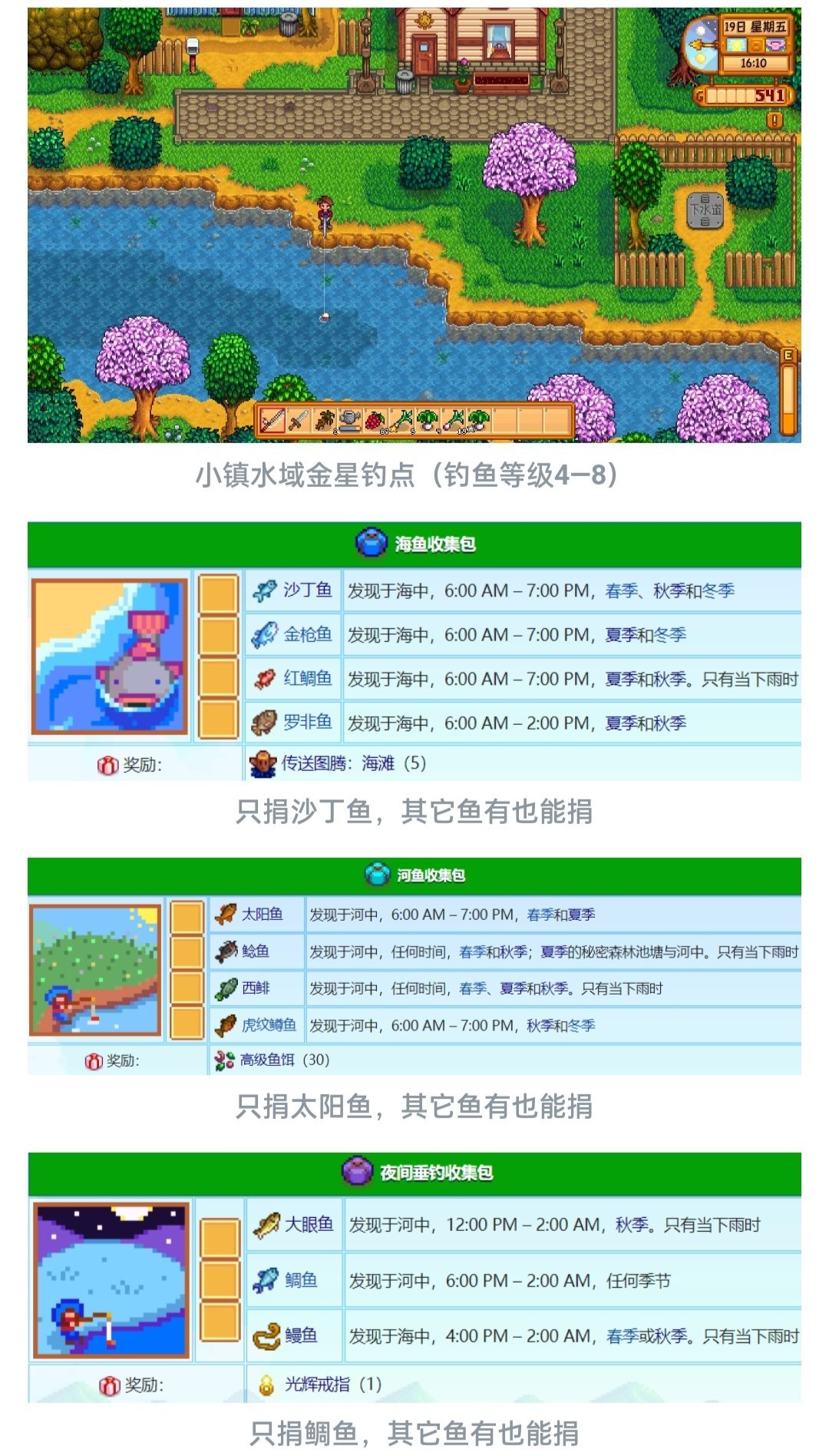 捐完后带上鱼竿,先到海滩钓鱼,晚上7.前沙丁鱼都会出没在海洋,钓到沙丁鱼就可以走了,之后前往小镇水域钓鱼,一直钓,直到钓到太阳鱼(晚上7.前出没)和鲷鱼(晚上6.后出没),之后就可以前往社区中心鱼缸板块捐赠这三条鱼了