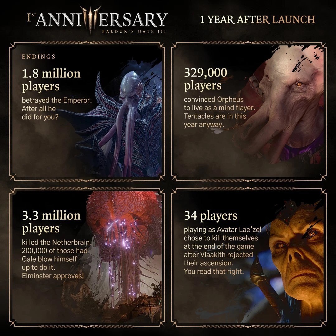 博德之门3》官方公开游戏一周年玩家数据,部分数据如下: