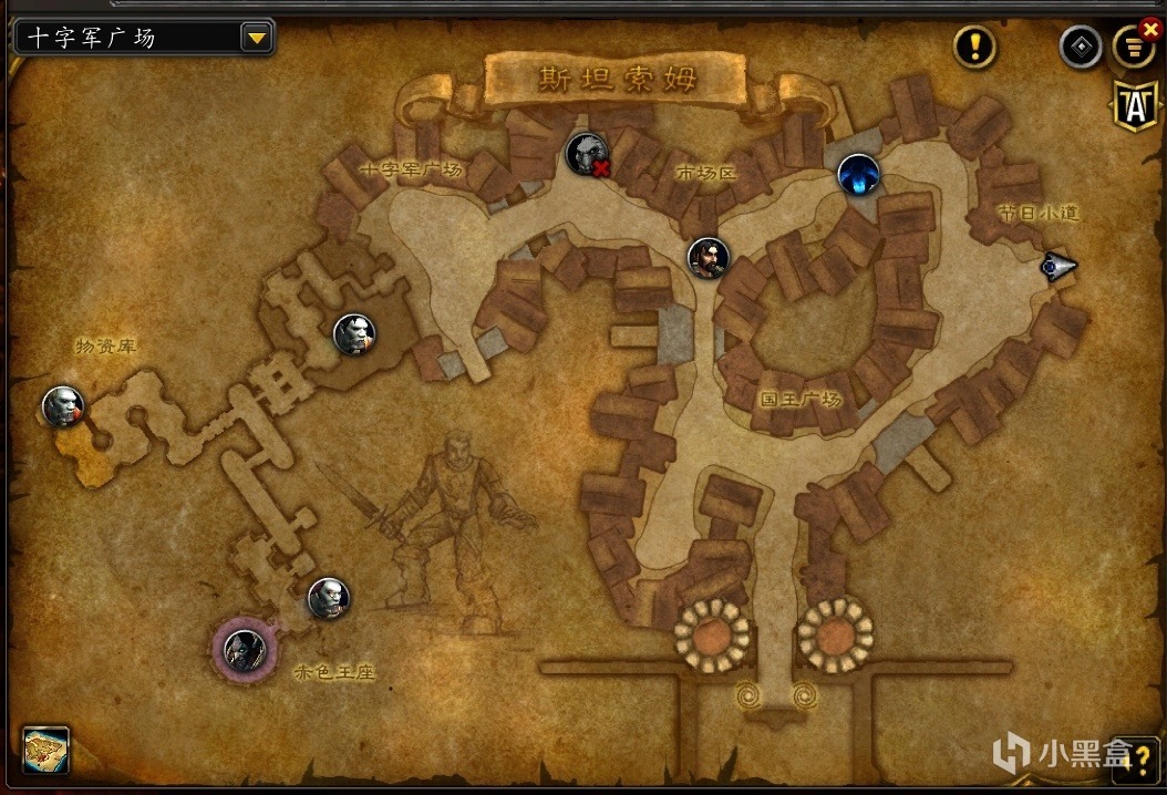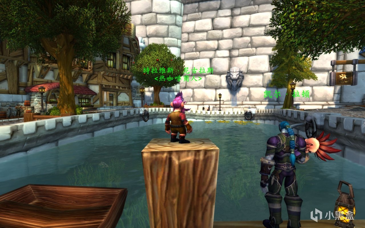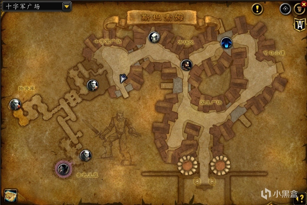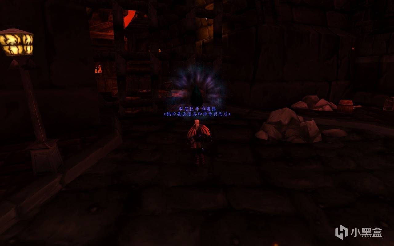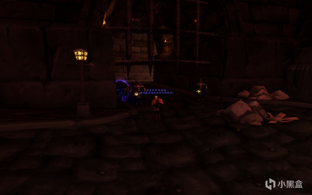 最后,是准备【3个黑暗符文】和【1杯黑咖啡】。黑暗符文再通灵学院解密里已经提到过了,【黑咖啡】可以在暴风城如图所示的位置购买,商人是木桩上的那个侏儒,地点位于贸易区和旧城区中间那条河的桥边,坐标是【69,65】。