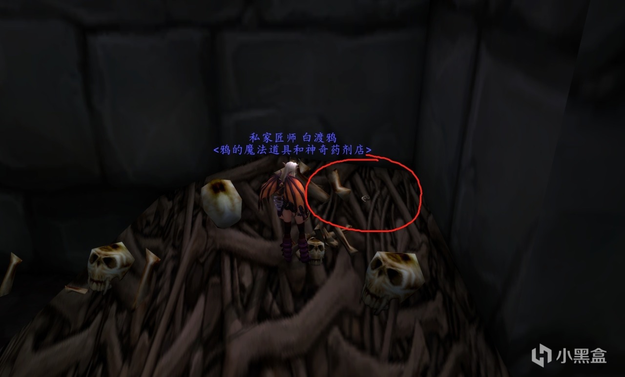 进入【老通灵学院】后,从【尸骨储藏所】的楼梯往下走,进入【血骨傀儡】所在的房间,在进门左手边第一个骨头堆靠墙的位置(图2红圈位置),可以拾取倒道具【开裂的银色黎明委任徽章】。
