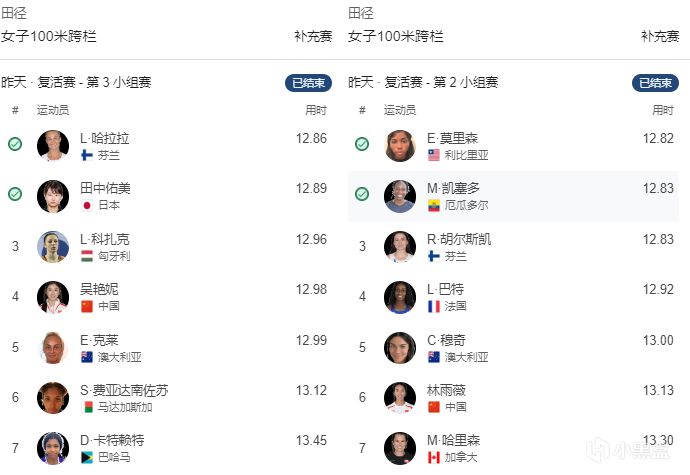昨天的田径比赛日,吴艳妮冲进13秒内,以12秒97排在第一小组的第六名,林雨薇以13秒24位列第五小组第七,两人均参加今天的复活赛!小组赛另一位人气王选手田中佑美,以12秒90成绩排在第二小组第五名,差一点就直接晋级,与吴艳妮同组的日本选手福部真子以12秒85直接晋级半决赛。
