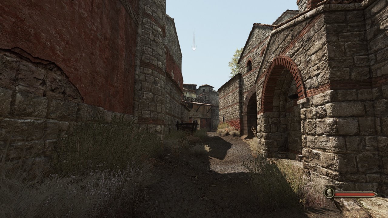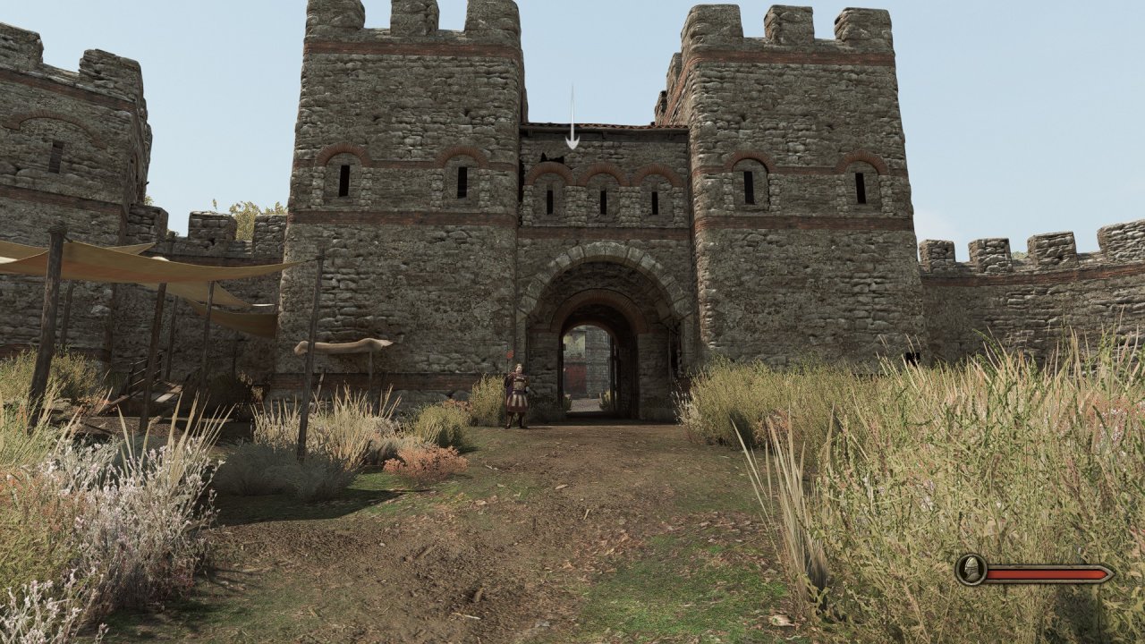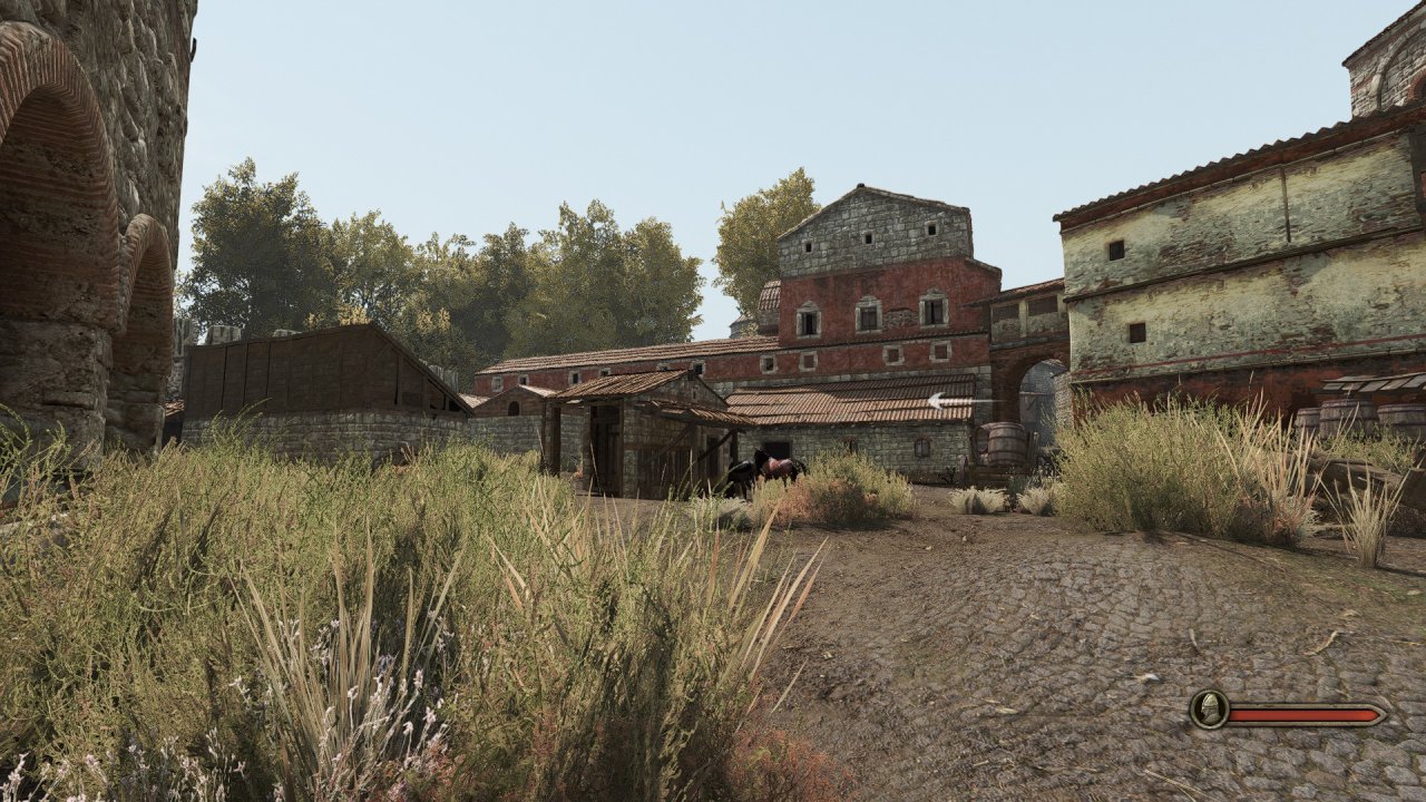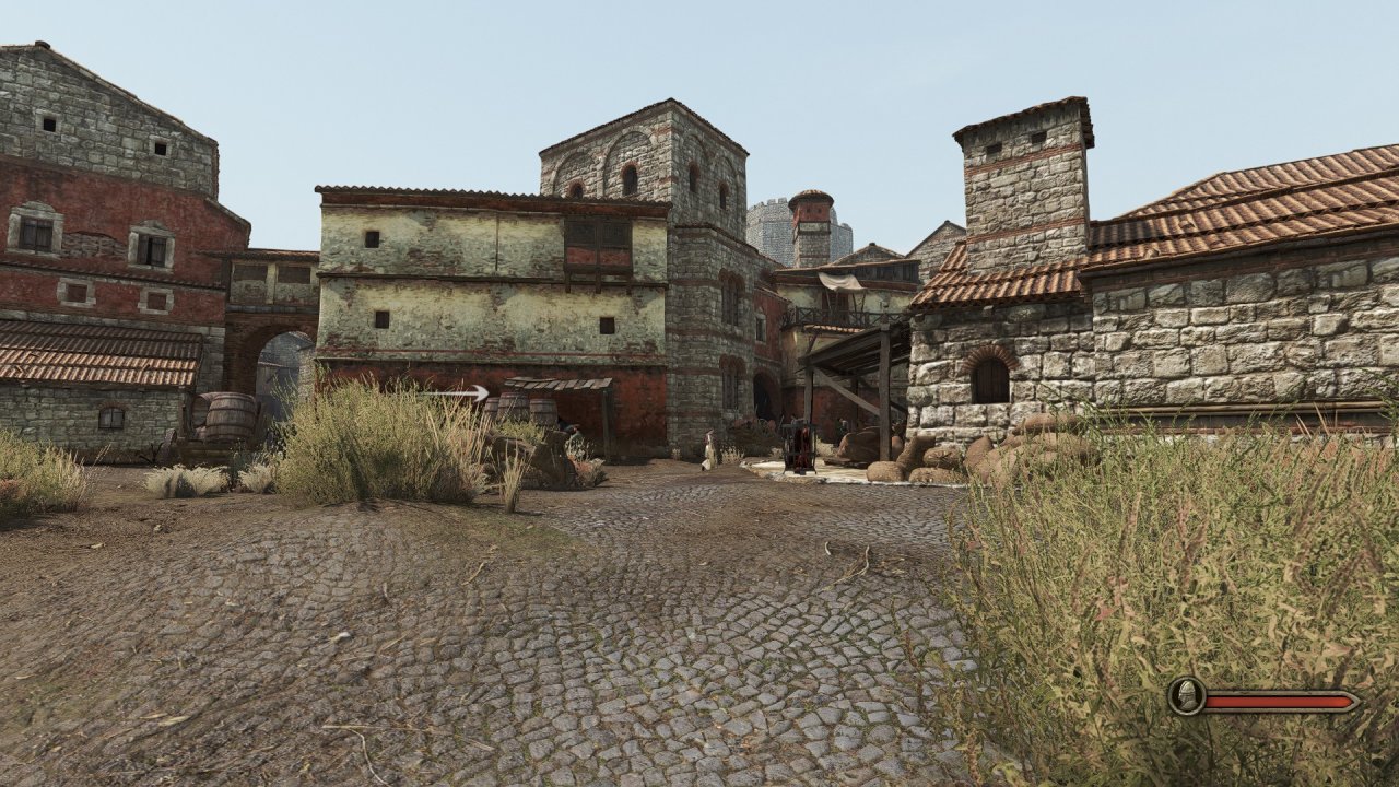 我們可以看到剛進入城門的建築物的外牆就有些破舊,顯示出歲月的痕跡。在建築物的前面,有一條用鵝卵石鋪成的小路,小路上散落着一些枯草和碎石。整個場景給人一種荒涼但寧靜的感覺,彷彿時間在這裏停滯不前。