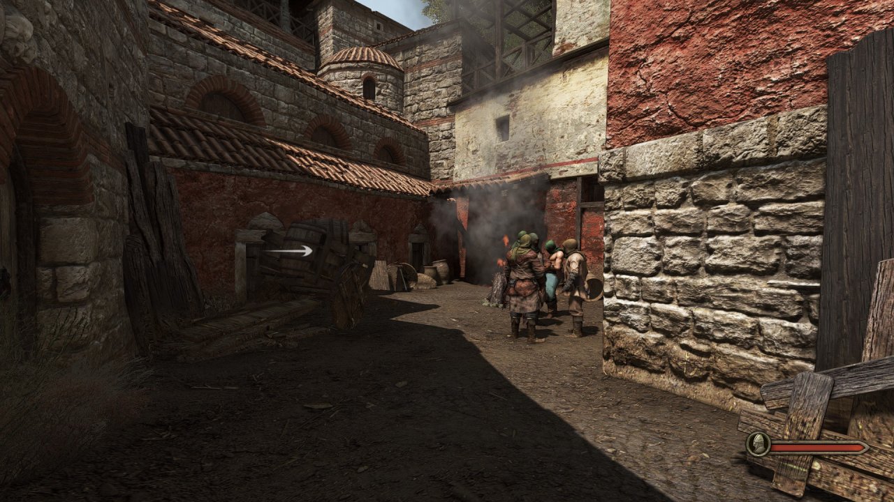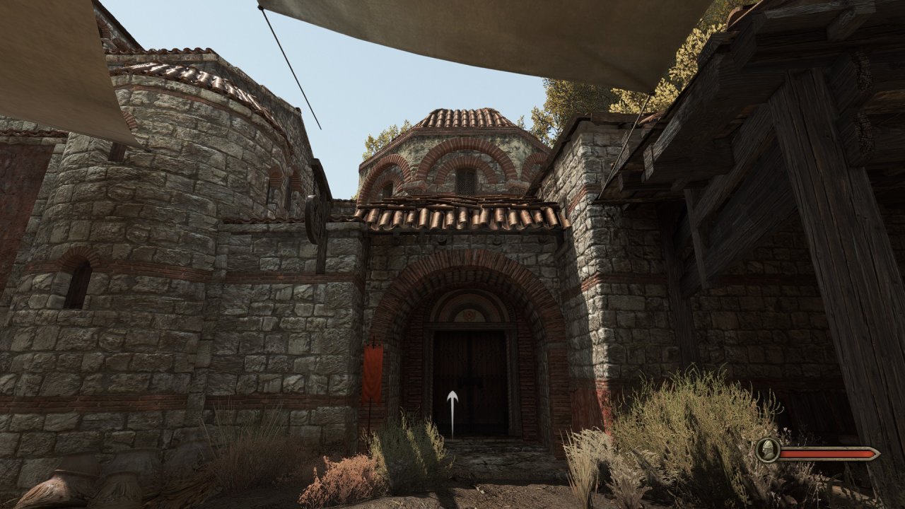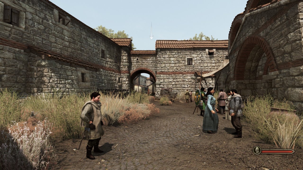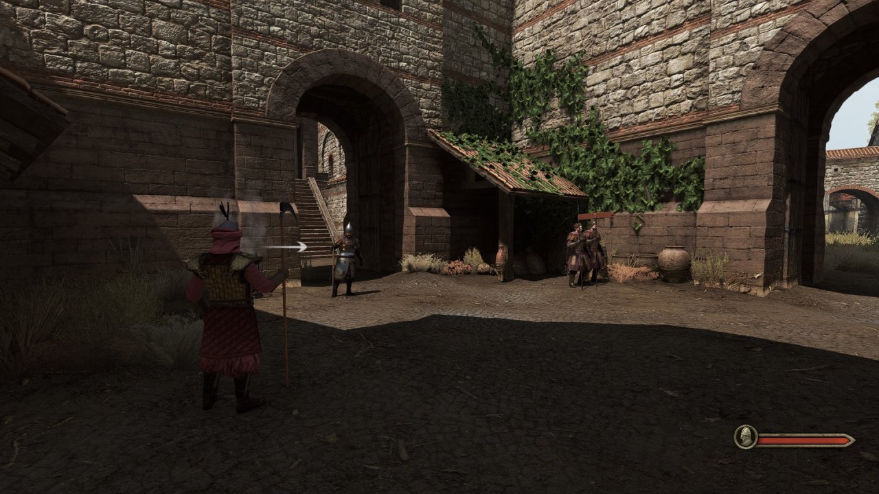 我們可以看到剛進入城門的建築物的外牆就有些破舊,顯示出歲月的痕跡。在建築物的前面,有一條用鵝卵石鋪成的小路,小路上散落着一些枯草和碎石。整個場景給人一種荒涼但寧靜的感覺,彷彿時間在這裏停滯不前。