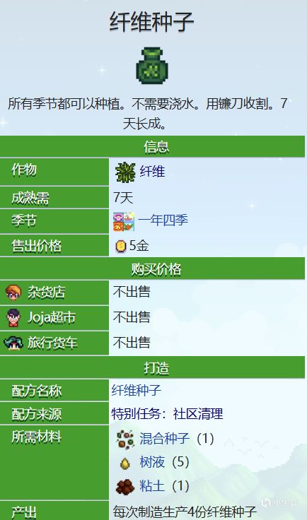 在完全長成後用鐮刀收穫可以掉落大約4到7個纖維,還有10%的概率掉落一個混合種子。