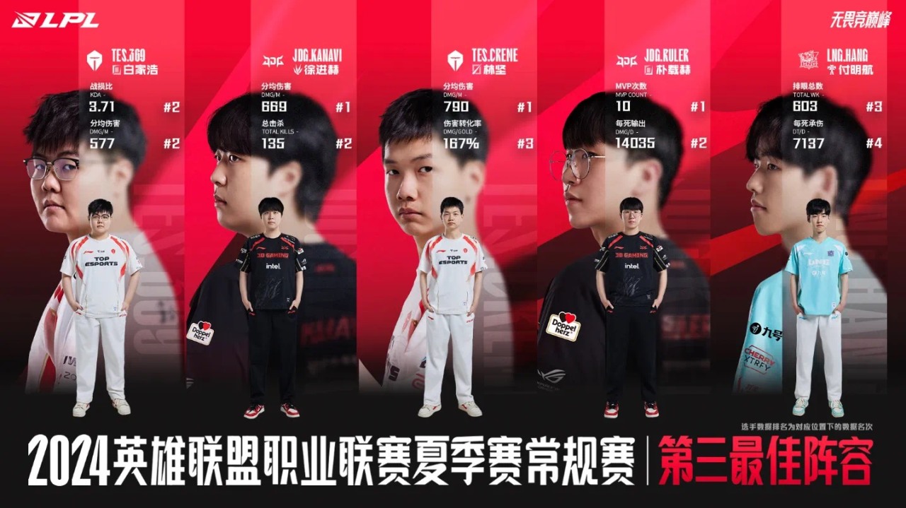 TES全隊登上最佳陣容,BLG作爲常規賽第一名但是打野和下路都沒有上榜,ELK其實與Ruler的票數較爲接近,但是可惜沒有上榜,而BLG打野位出現了輪換,所以數據方面相比於其他打滿場次的打野有所欠缺。