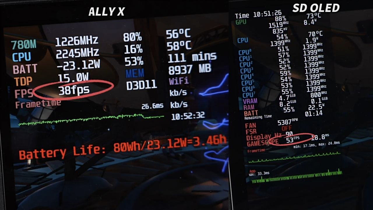 拿星際拓荒這款遊戲舉例,720P中畫質下,同樣的15WTDP功耗,SD可以說是碾壓rog ally x,幀生成時間也有問題,當然嚴格意義上來說,也可能並不是優化好,而是因爲rog運行這個遊戲的時候優化不好或者有bug