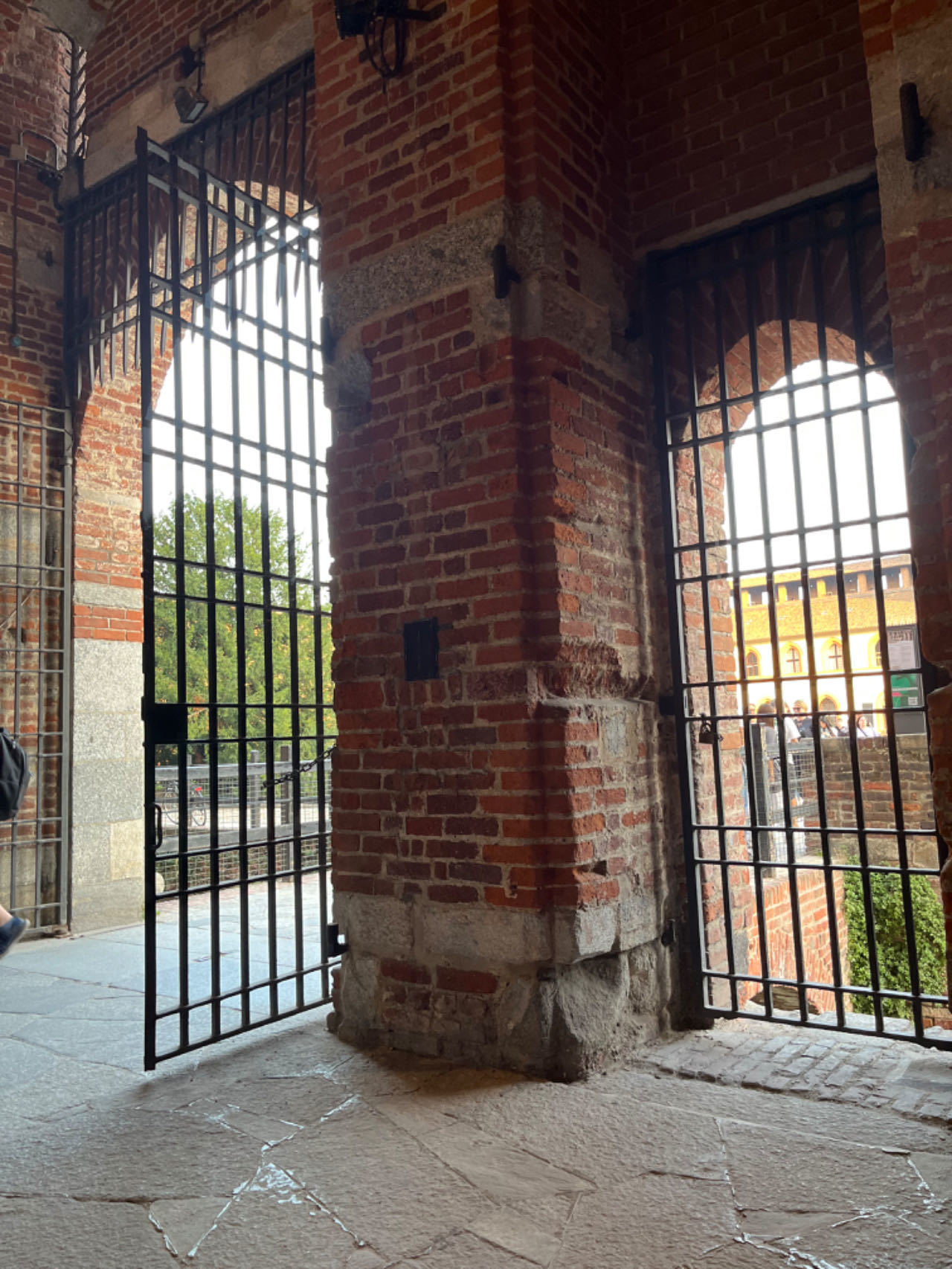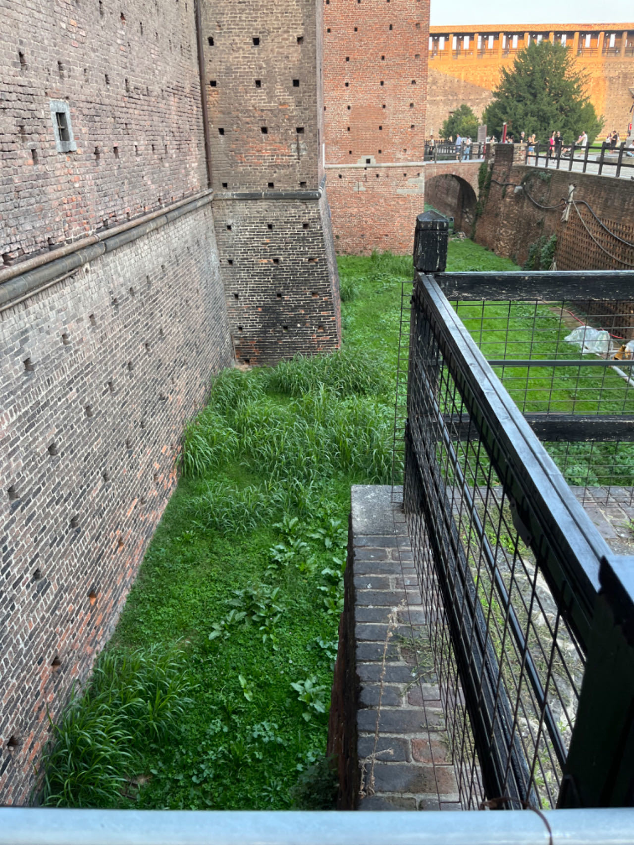 除了主城门,斯福尔扎堡还有多个城门,分布在四面八方。这些城门大都有铁闸门,游览区的开着,其他地方紧闭。进入城墙内部,细细观察干涸的护城河上的泥巴杂草与吊桥,转头看城墙和塔楼,不由得想起了小时候看的历史书的城堡剖面图。