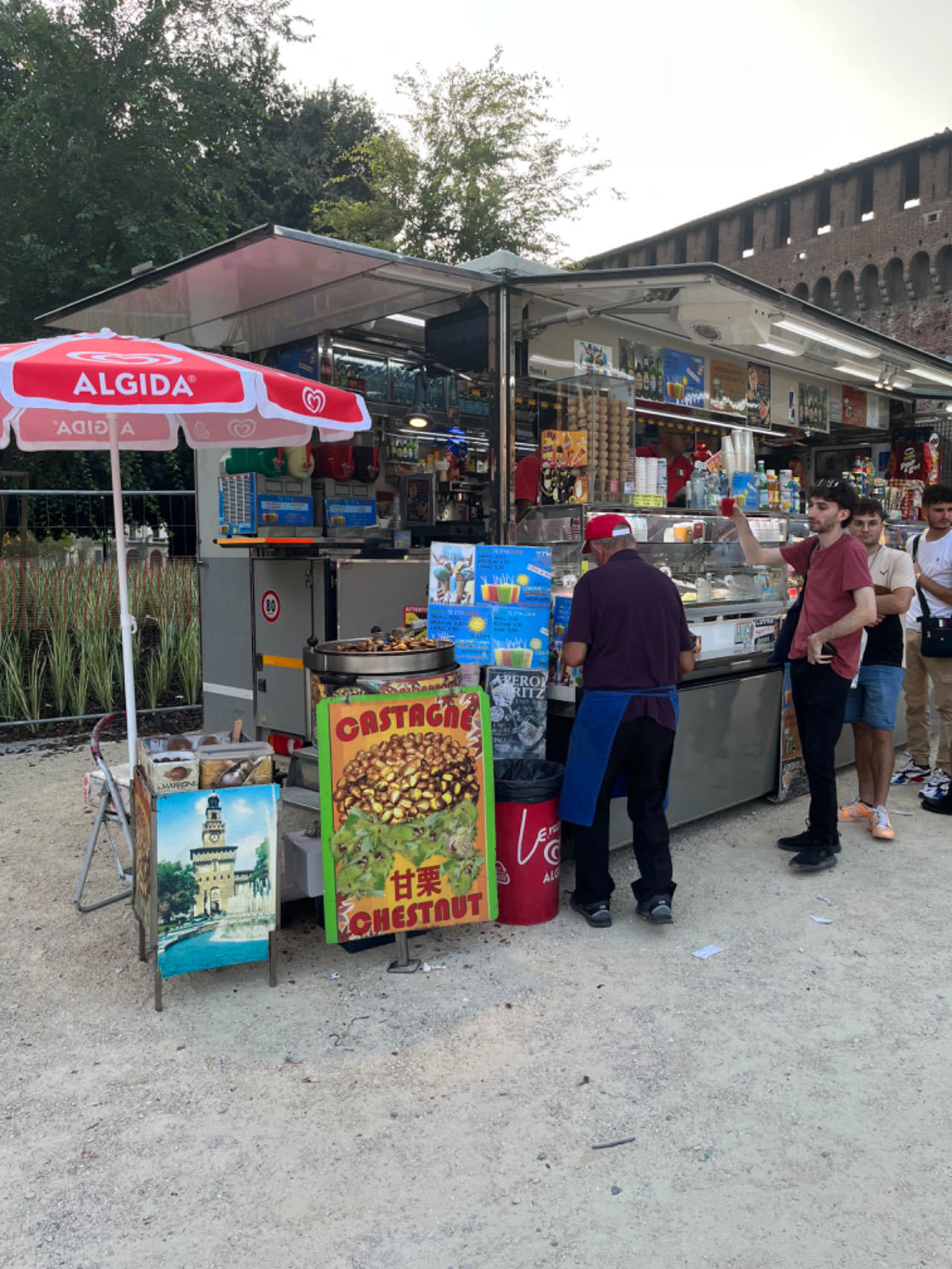 正前方的塔楼外形酷似佛罗伦萨的领主宫,也不知是谁借鉴了谁。门口坑蒙拐骗的恶棍不多,倒是有表演杂技的艺人。小吃车与店铺整齐地排列在周围,有饮品、冰淇淋和甜点,也有汉堡,我好不容易忍住咽下了口水。看着系着蓝色围裙的意大利老大爷和他身边的“甘栗”标语,我还以为自己回到了家乡的南大街小吃街或滁州的夜市摊。