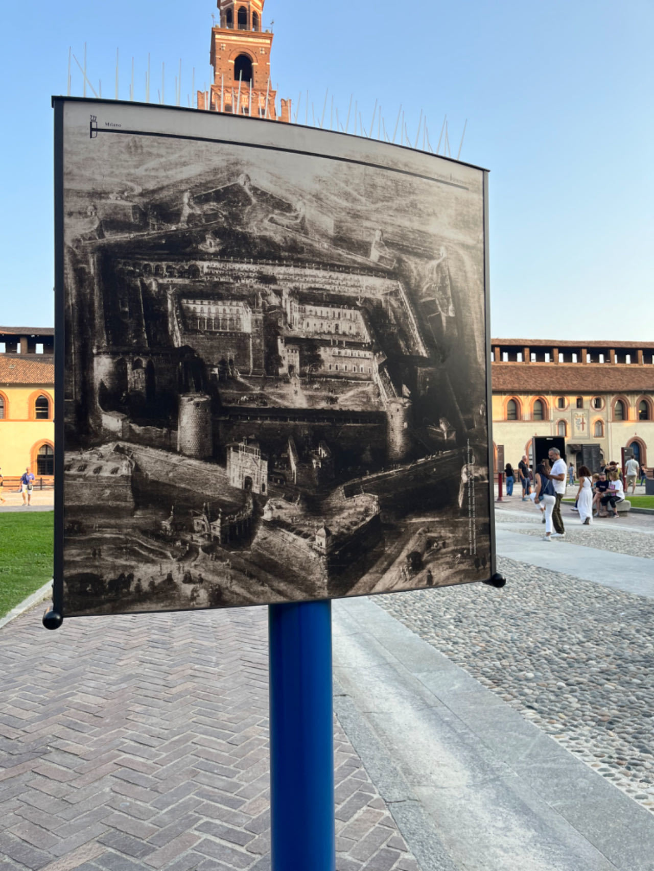 斯福尔扎堡本来是维斯孔蒂家族所建,后来斯福尔扎家族在里面建了文艺复兴式府邸,因此整个城堡是中世纪风格与文艺复兴风格的混杂。