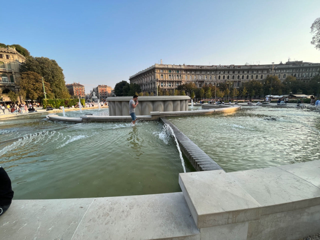 回到斯福尔扎堡,它的前方是郁郁葱葱的植被,有高大的树木,也有与人齐高的灌木丛。巨型水池是螺旋阶梯型,不少游人和市民坐在池边休息,或者干脆走进去戏水。