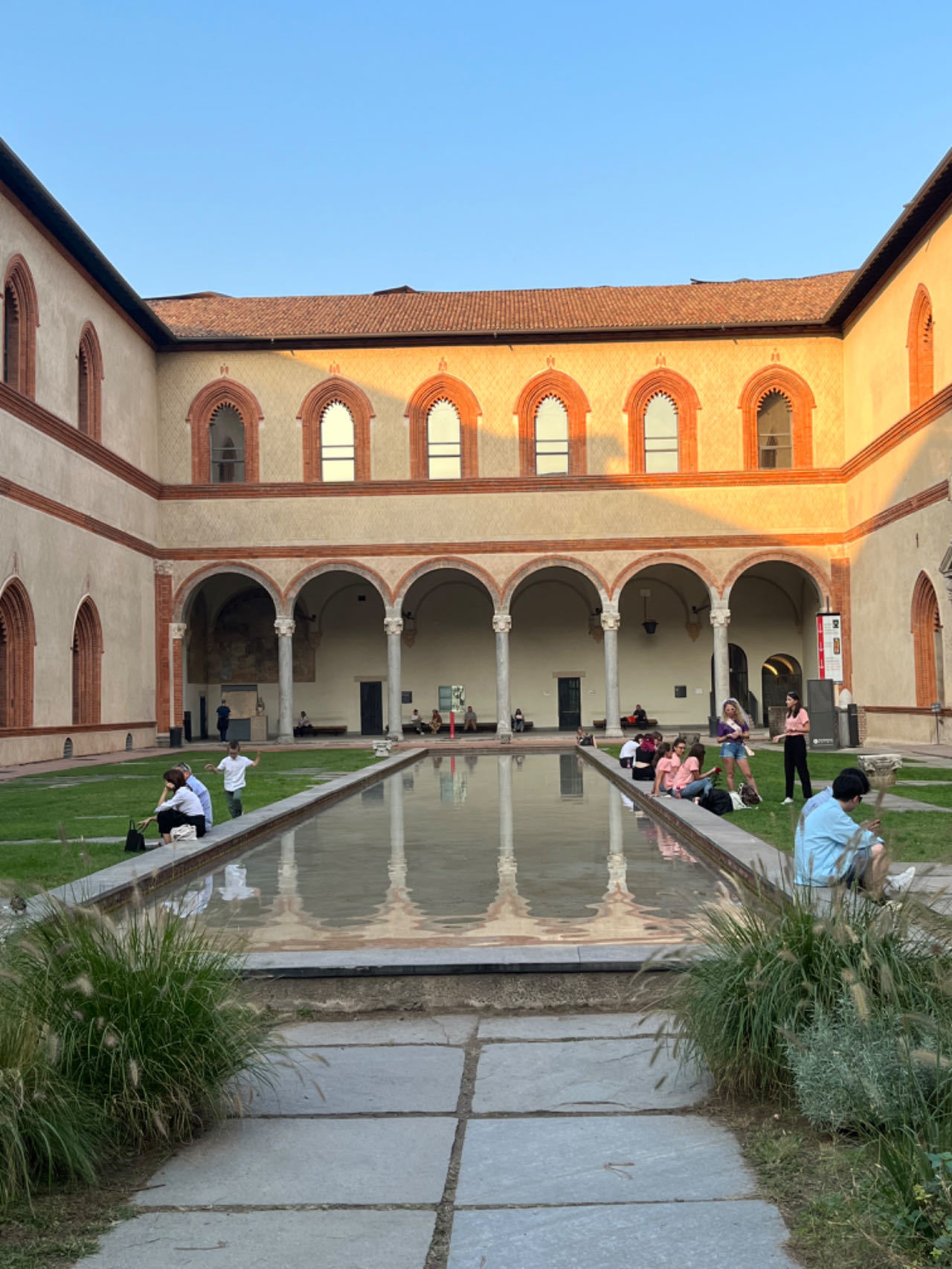 城堡深处的庭院很静谧,池子里还有一层浅水。走廊里的柱子很有刺客信条的风格。我想,也许卡特琳娜·斯福尔扎在嫁给教皇的侄子前,也许正是在这个走廊里与兄弟姐妹追逐打闹,并坐在水池边听家庭教师传授宫廷礼仪。