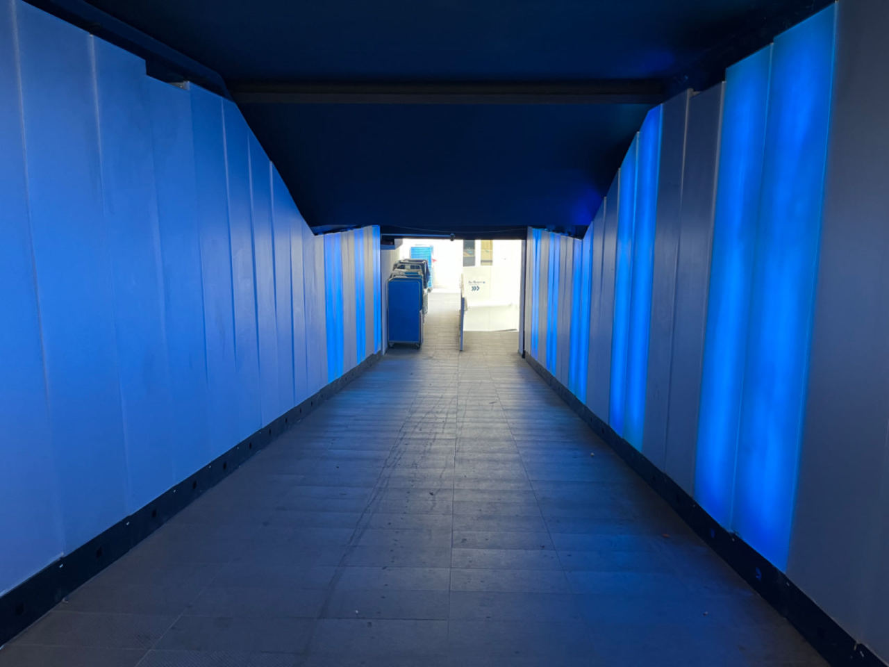 进了门,平缓的楼道逐渐上升。两边墙壁散发着淡蓝色的光,廊道很狭长,氛围既神秘又诡异,搞得像意大利兄弟会接头的秘密据点。我走在路上时,心里还有点小忐忑,毕竟是第一次在国外住酒店。